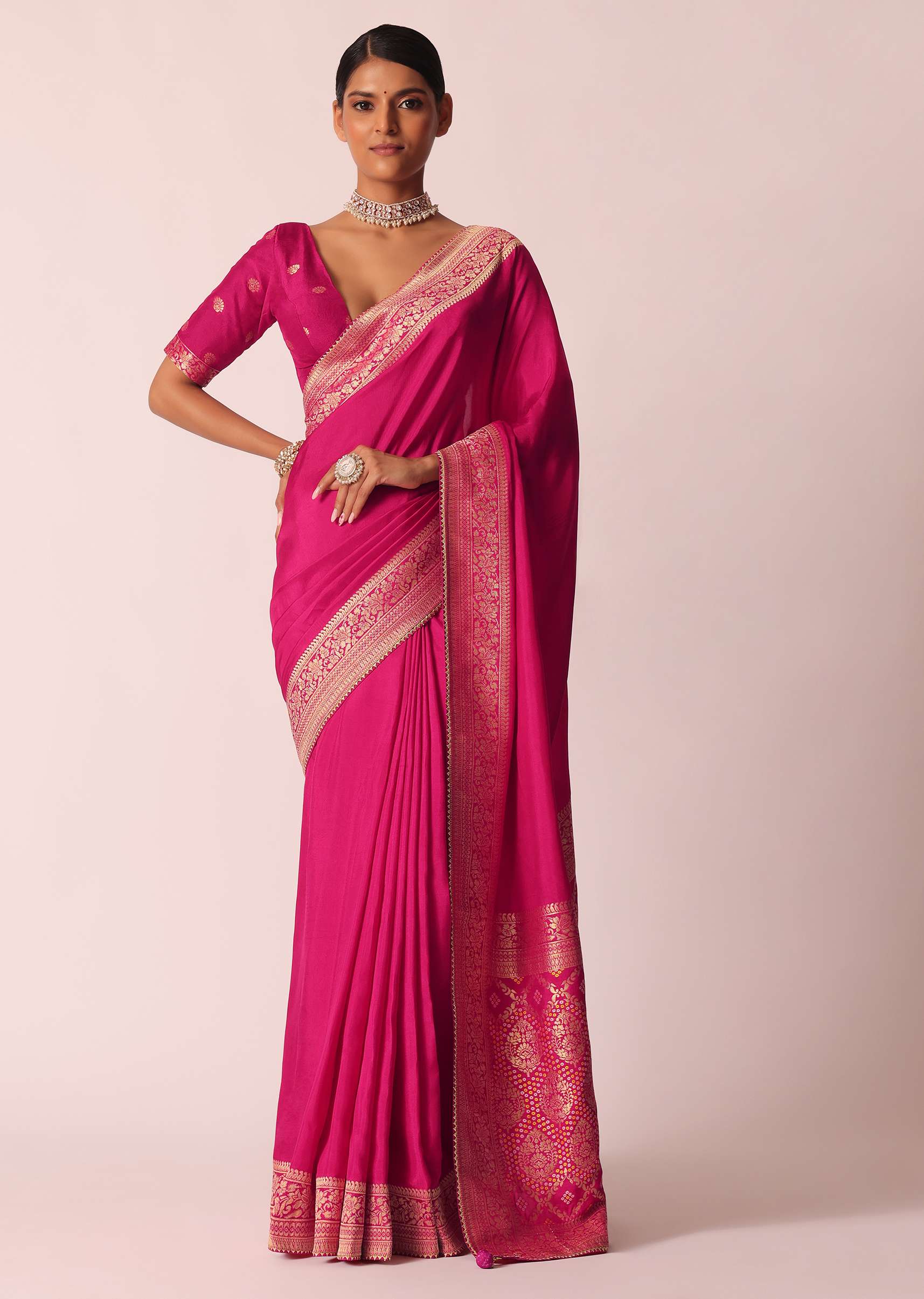 Rani Pink Woven Saree In Silk with Bandhani Detail And Unstitched Blouse Piece