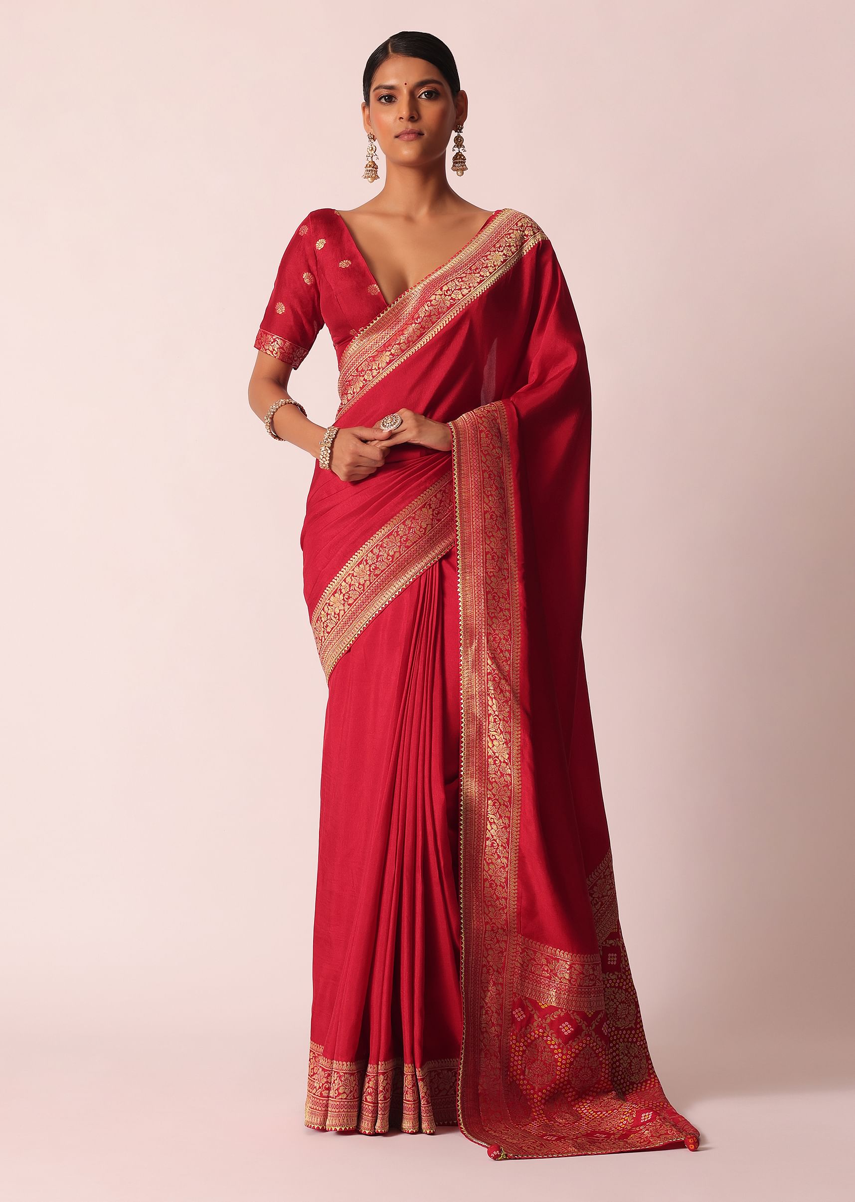 Red Bandhani Silk Woven Saree With Unstitched Blouse Piece