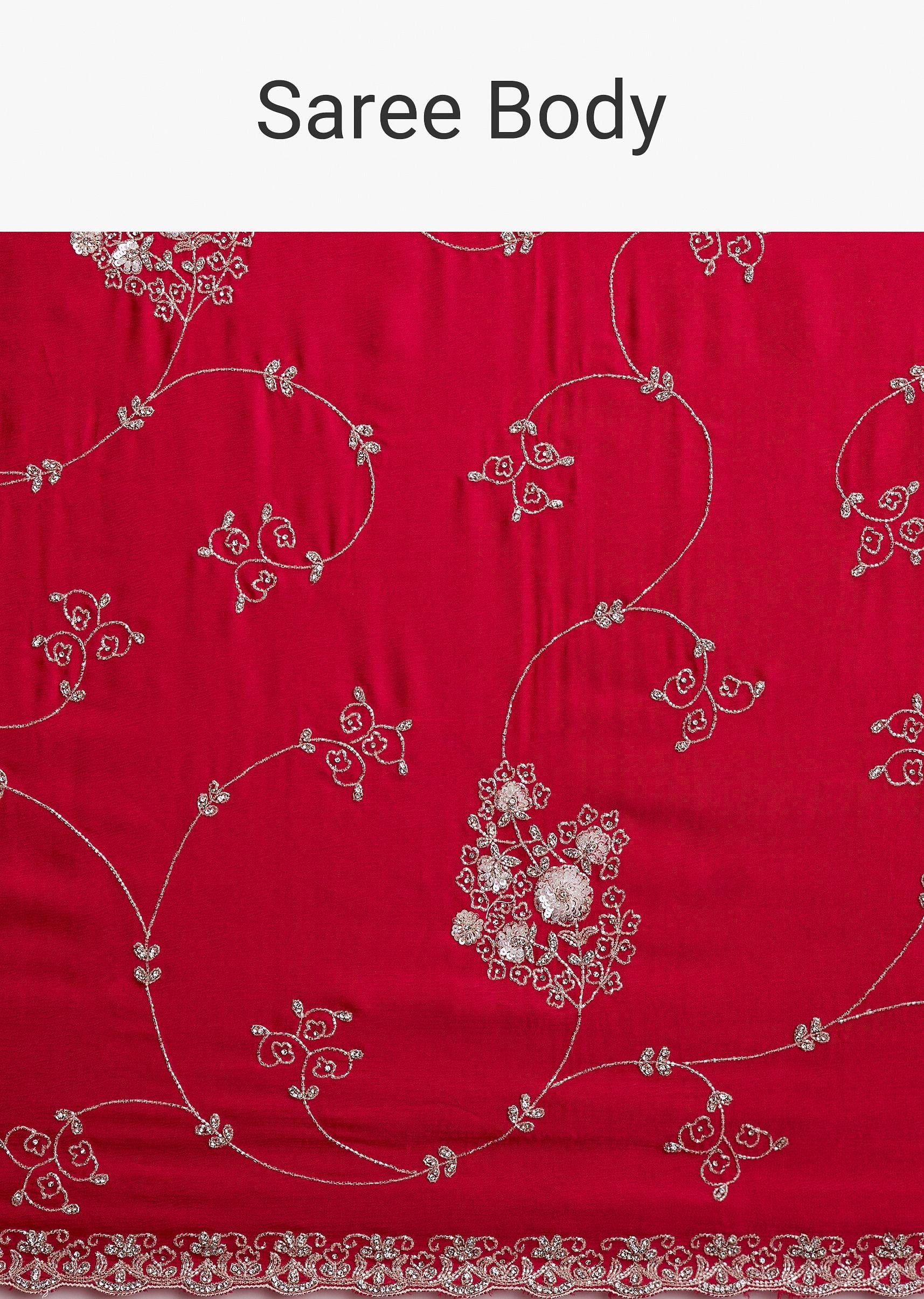 Red Chinon Saree With Floral Cutdana Sequins Jaal And Scallop Border