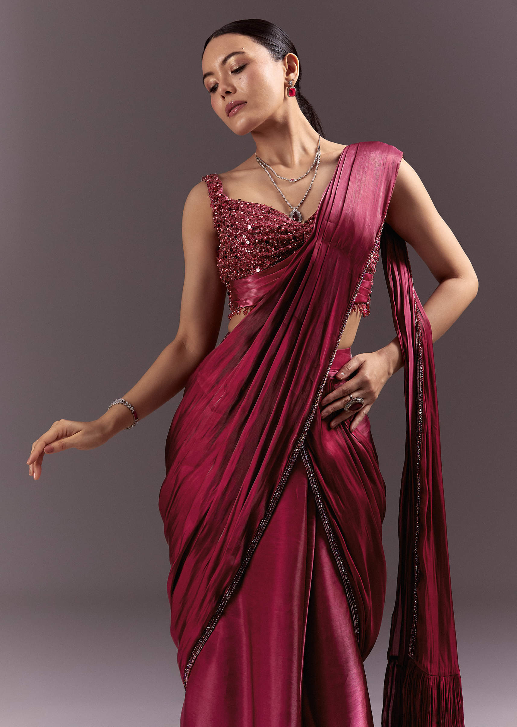 Red Pre Stitched Saree With Sleeveless V Neck Blouse