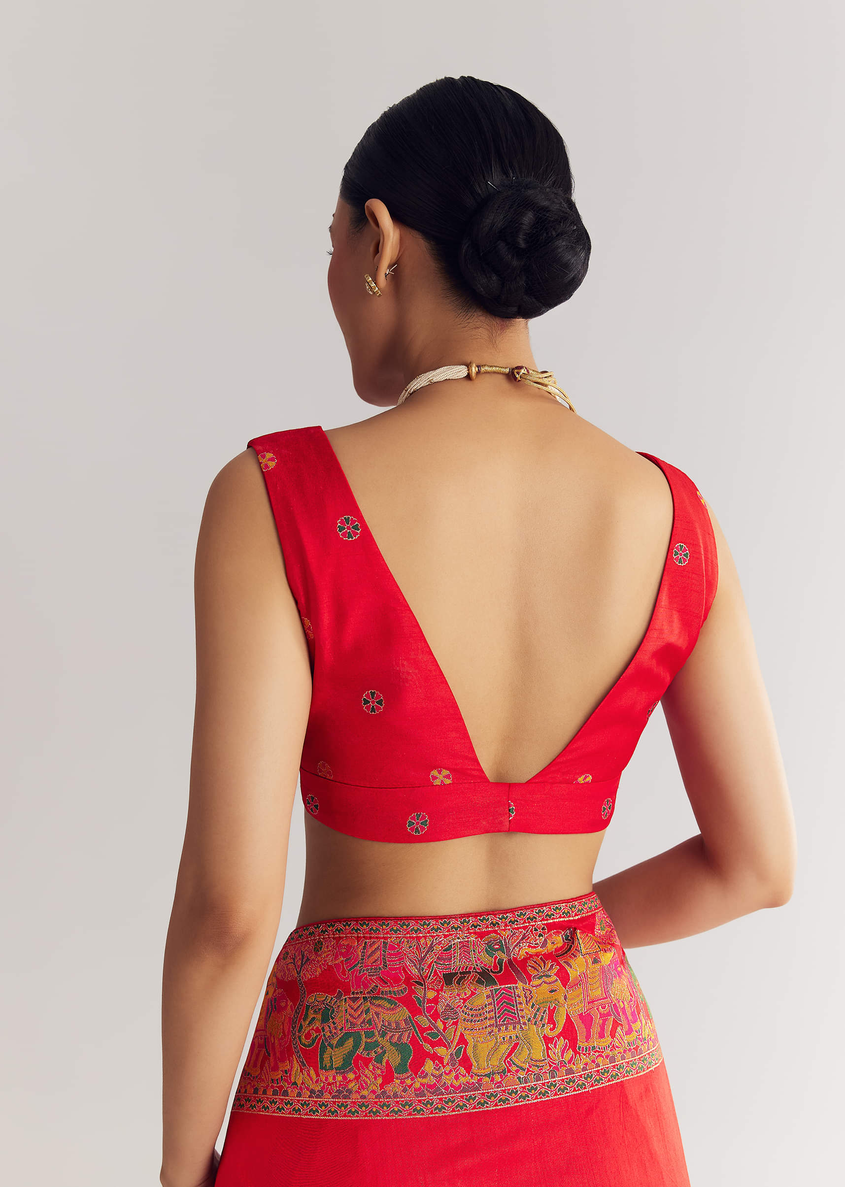 Unveil your festive spirit with this tranditional floral & animal elements printed red saree. A stunner for engagement parties and festive evenings. An heirloom-in-the-making crafted for precious moments. This is more than attire, it's your festive persona. Awarded as the Most Trusted Brand, we're delivering styles you love, just as promised.