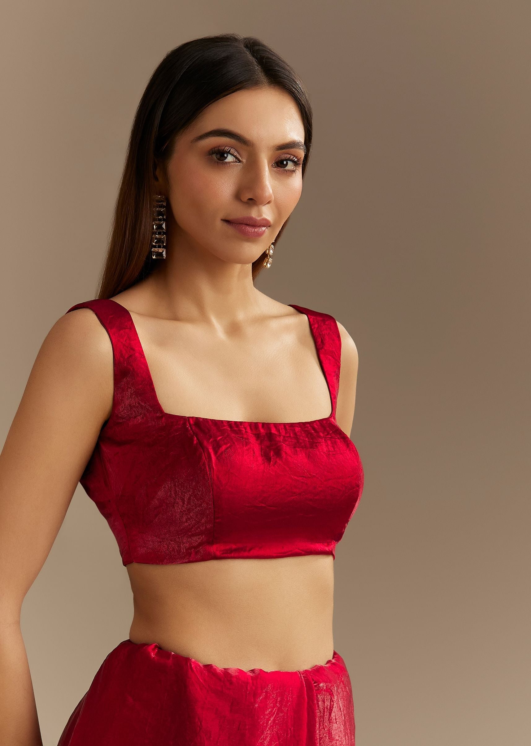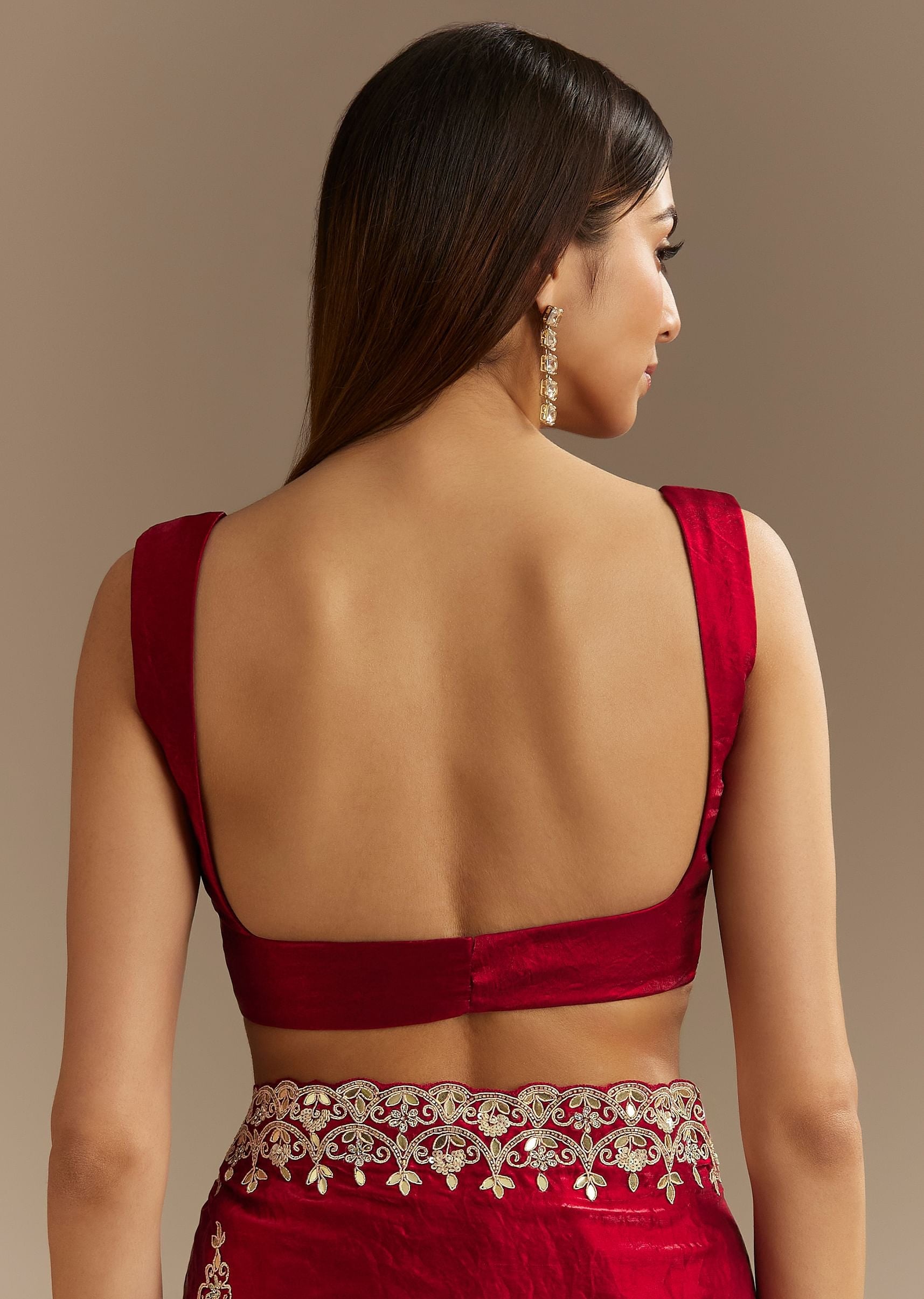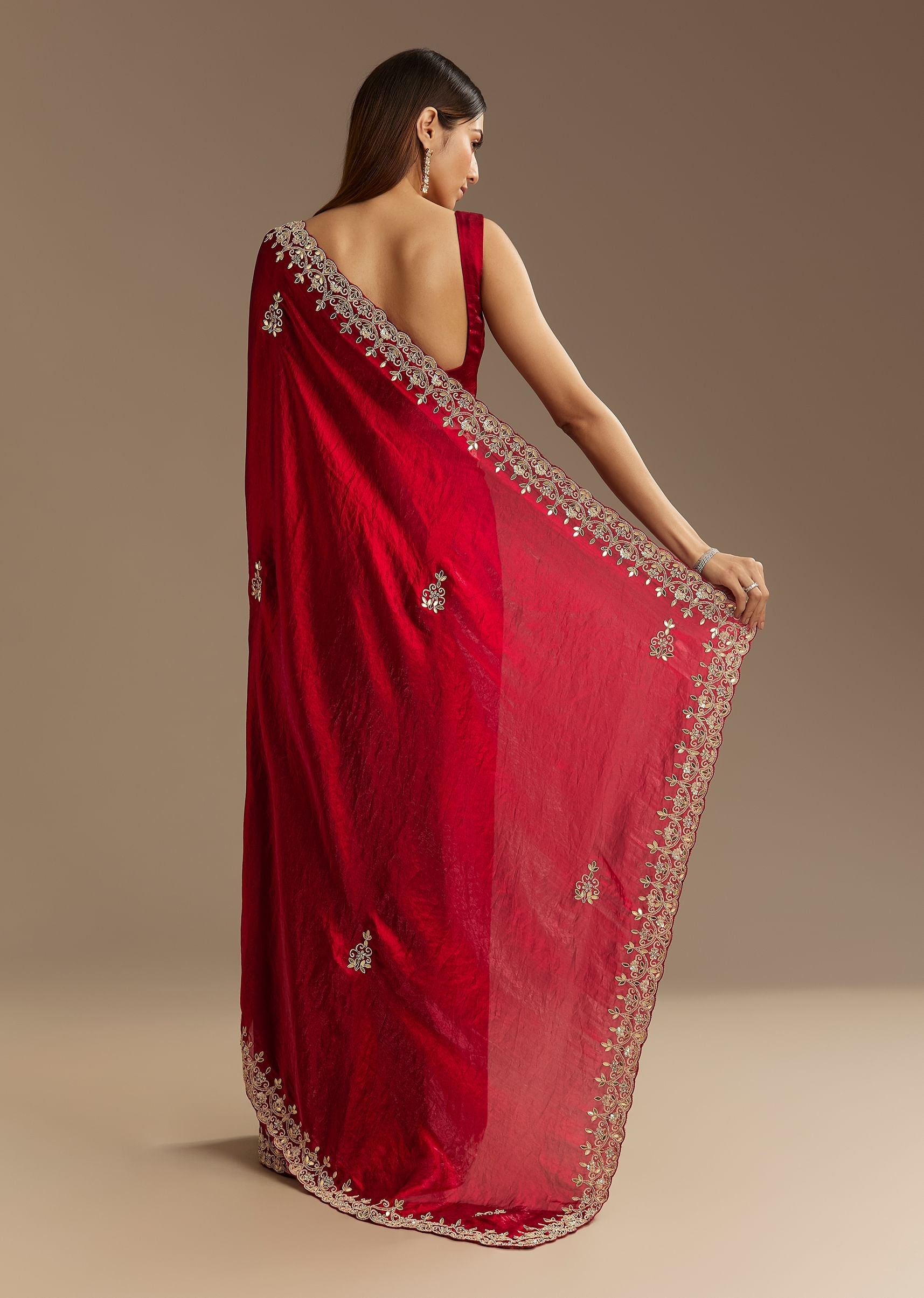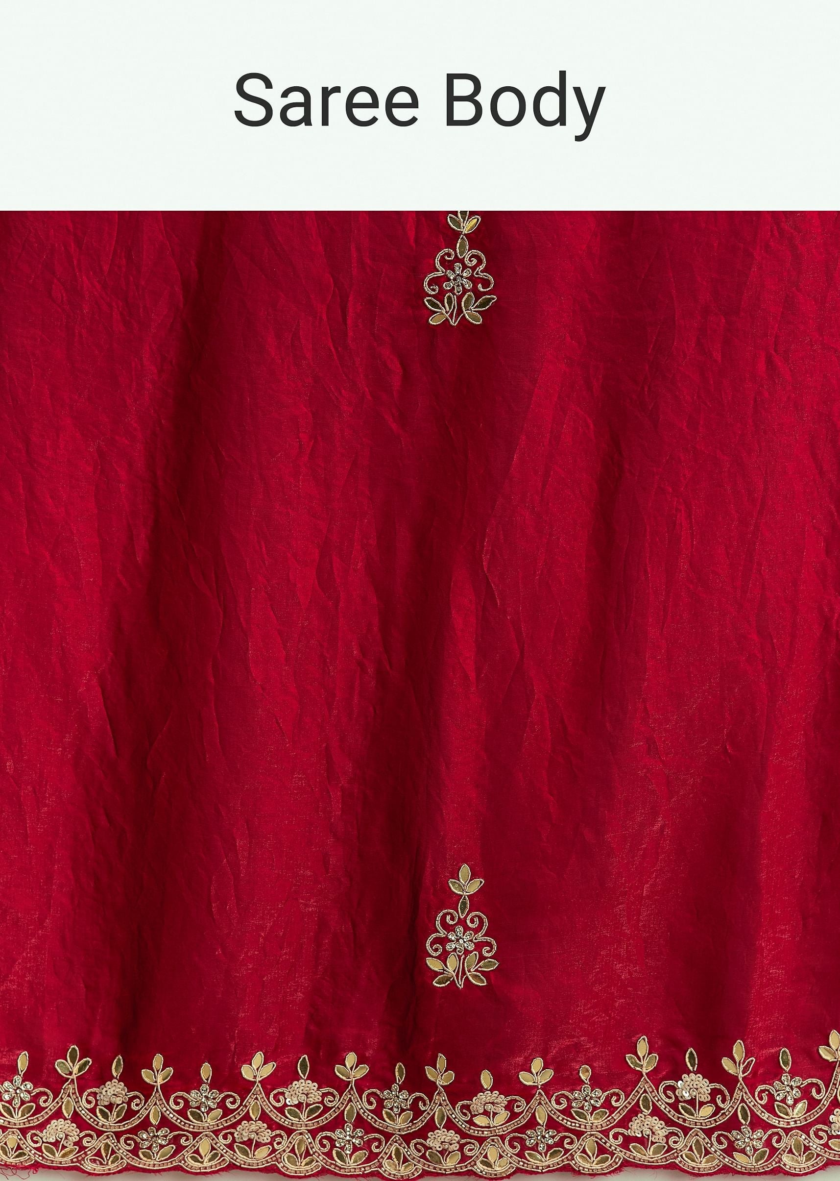 - Drape Yourself In Refined Luxury With This Red Satin Saree Intricately Embroidered With Shimmering Sequins Cutdana And Delicate Gotapatti Work.