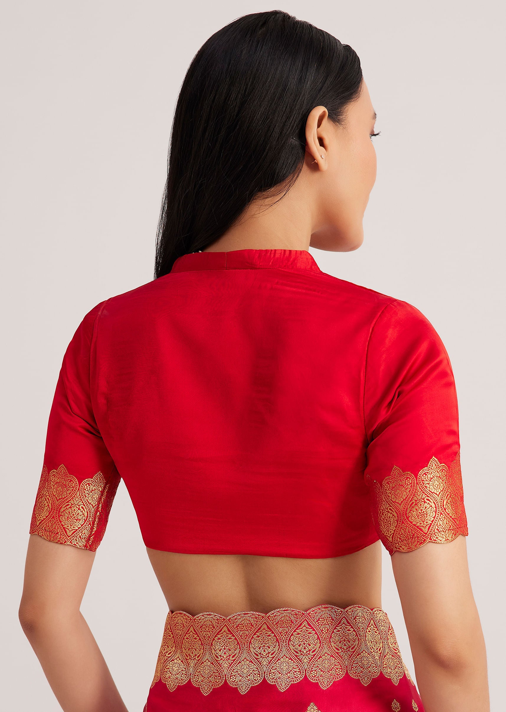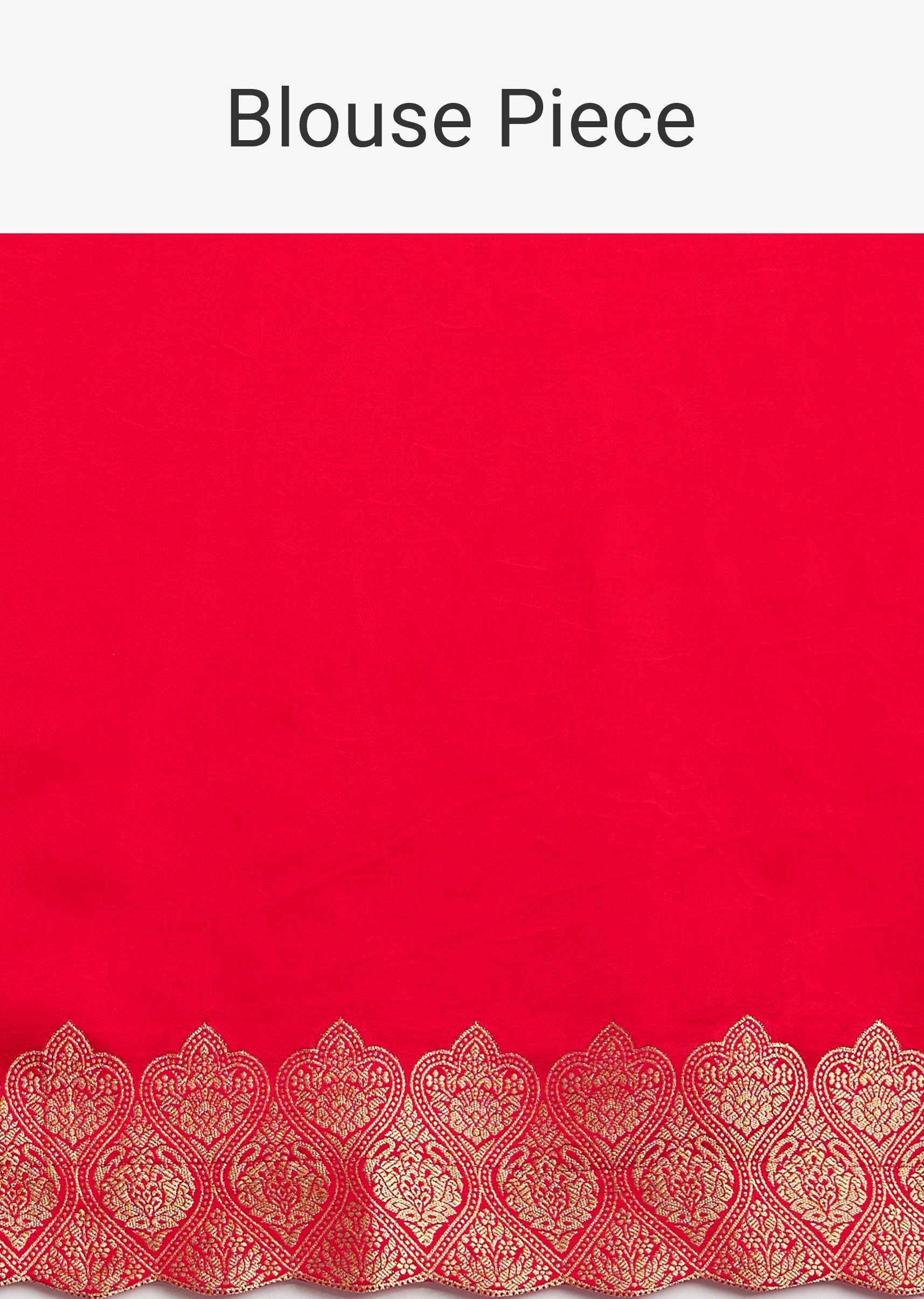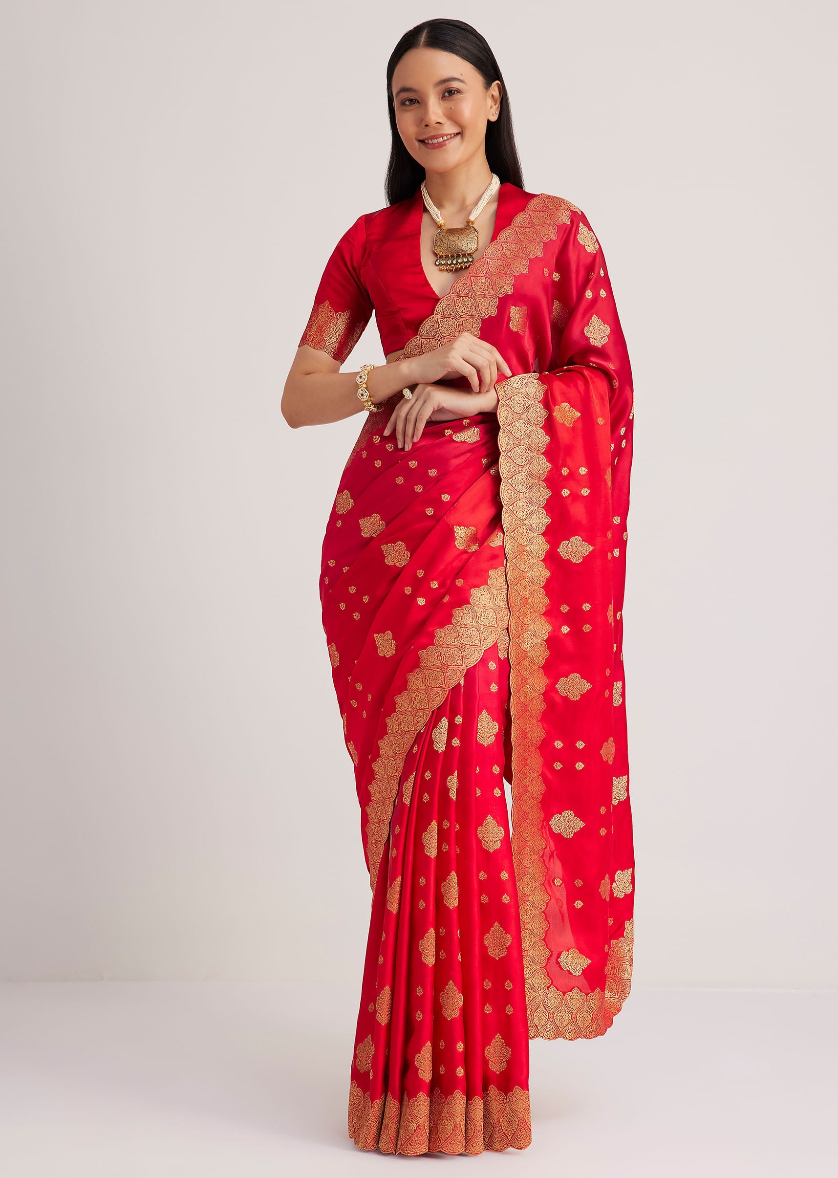 Red Satin Silk Butti Woven Saree With Scallop Brocade Border