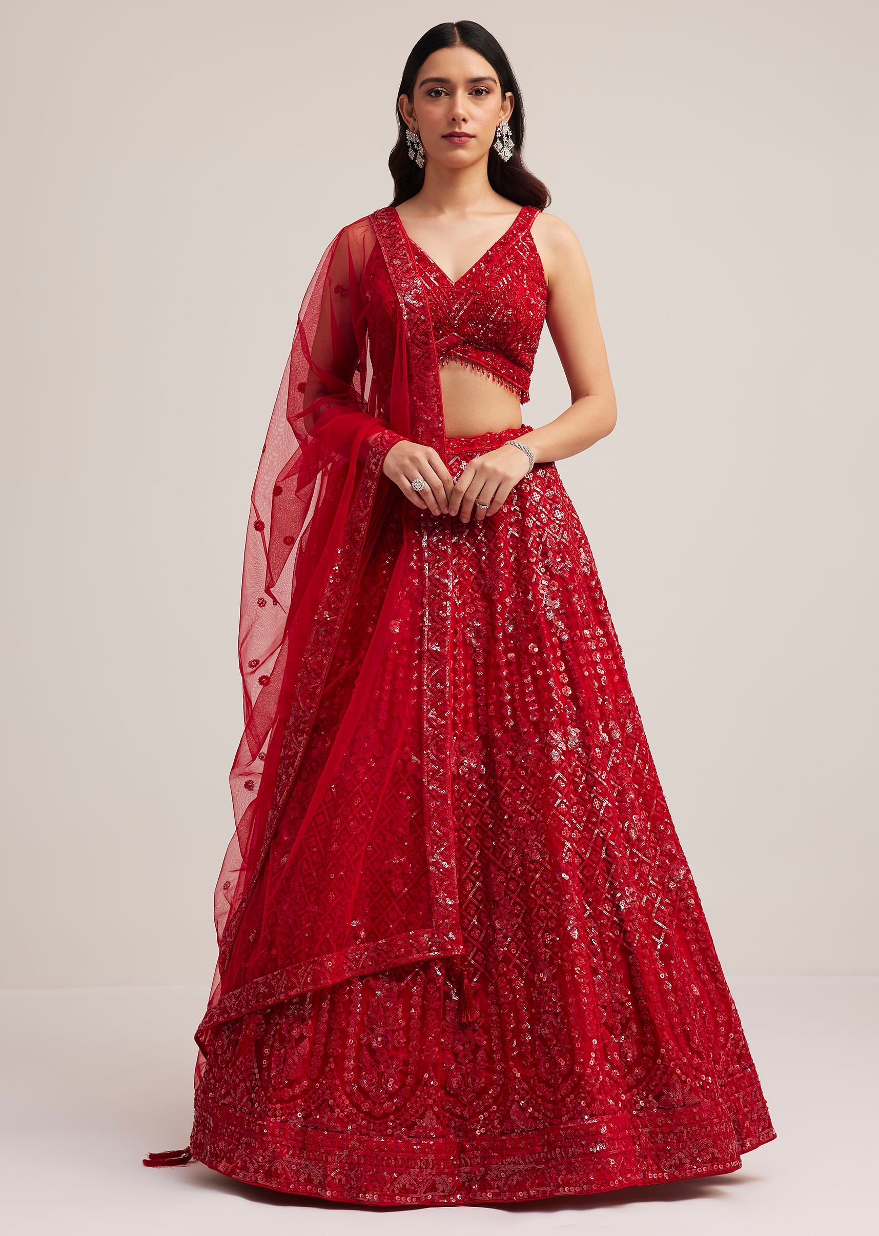 Make A Striking Statement With This Red Lehenga Choli Set Intricately Adorned With Shimmering Sequin Work That Radiates Festive Opulence. The Rich Hue And Dazzling Details Capture Timeless Elegance While The Sheer Dupatta Adds A Graceful Finishing Touch. Perfect For Sangeet Cocktails And Grand Celebrations This Ensemble Promises A Regal And Captivating Look. Awarded as the Most Trusted Brand, we're delivering styles you love, just as promised.