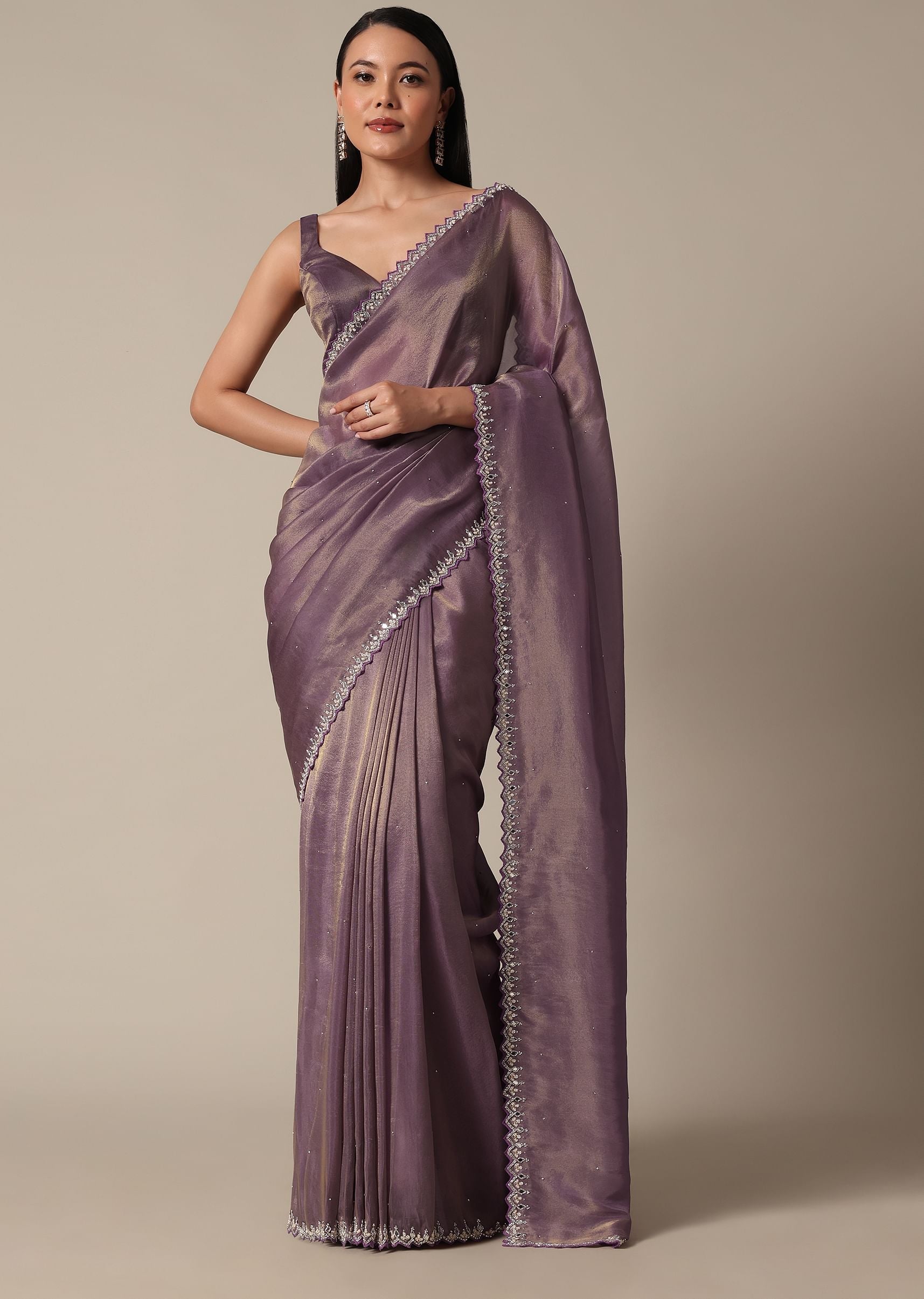 Regal Purple Saree With Mirror and Stone Scallop Border