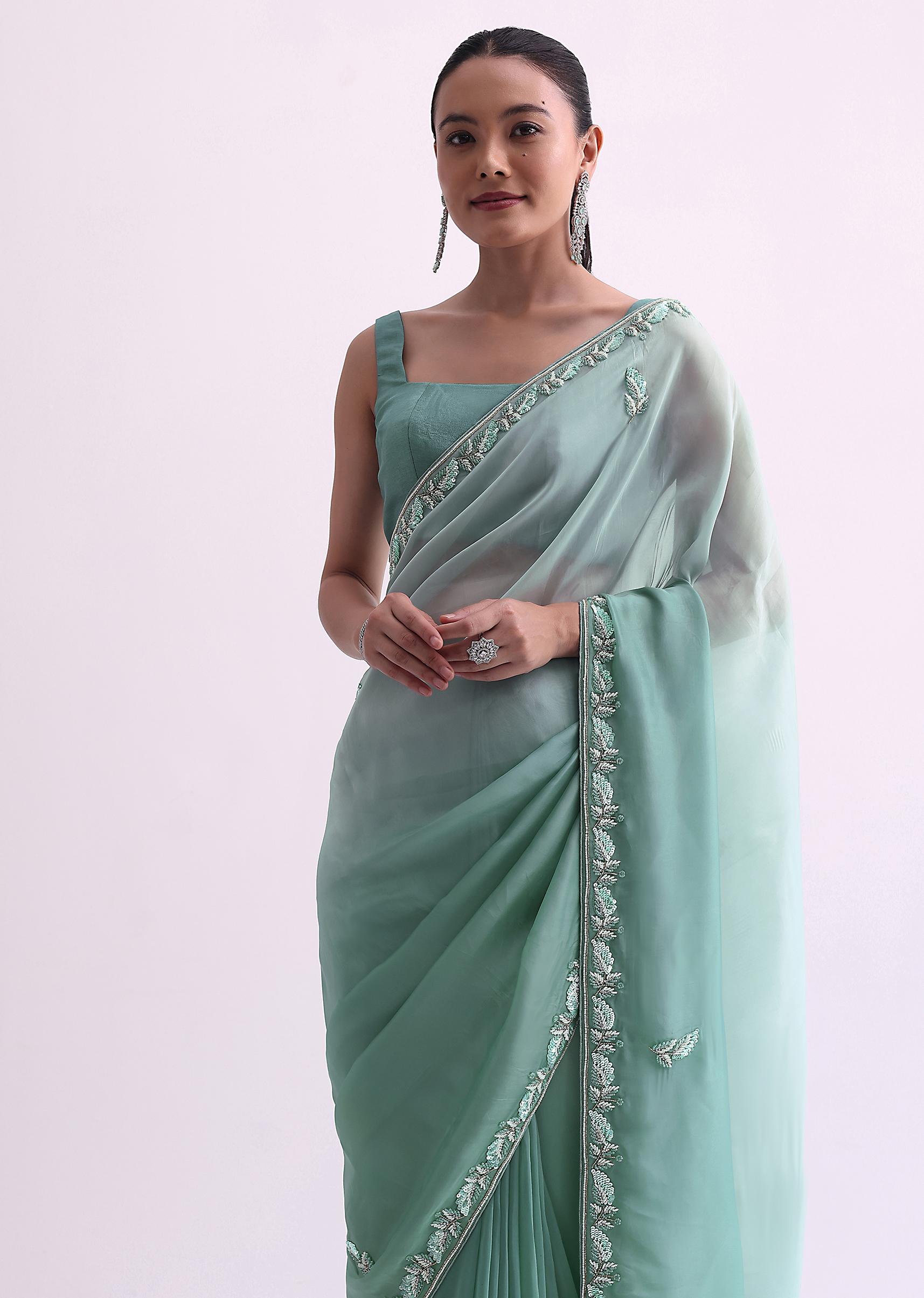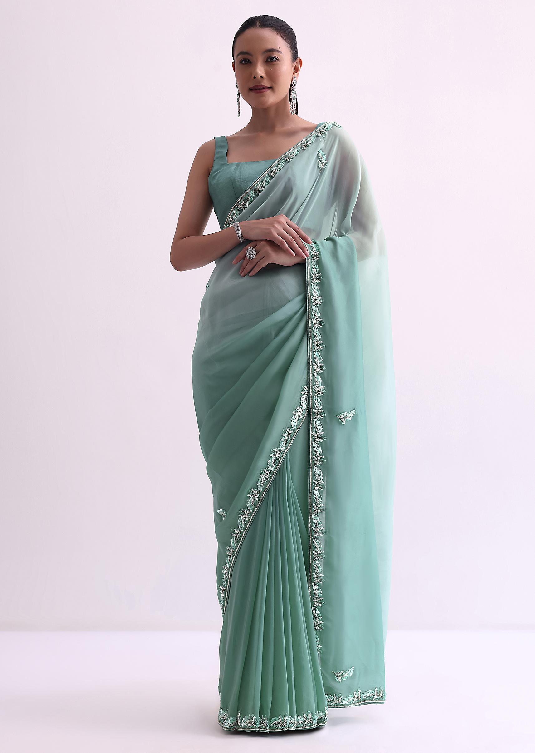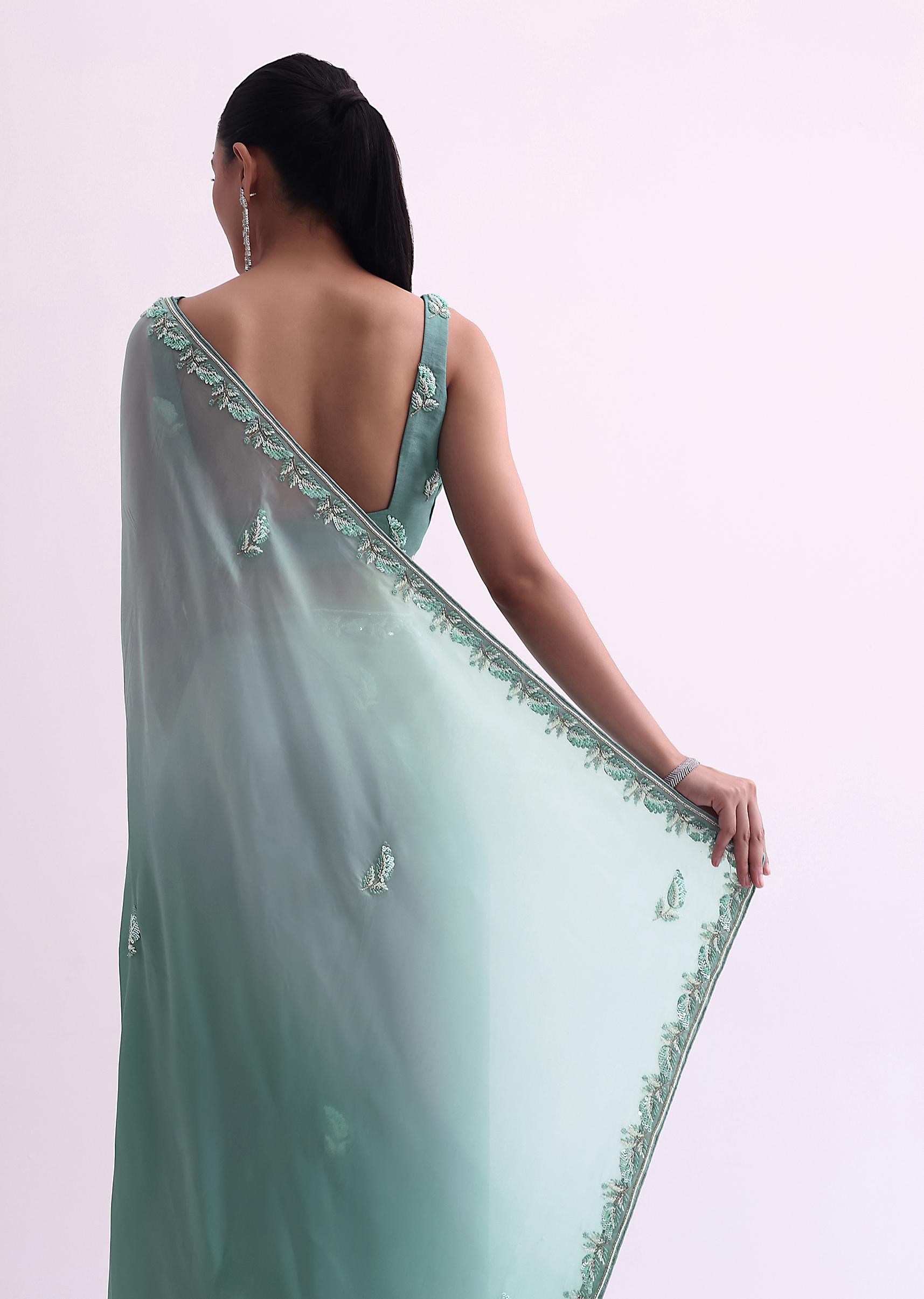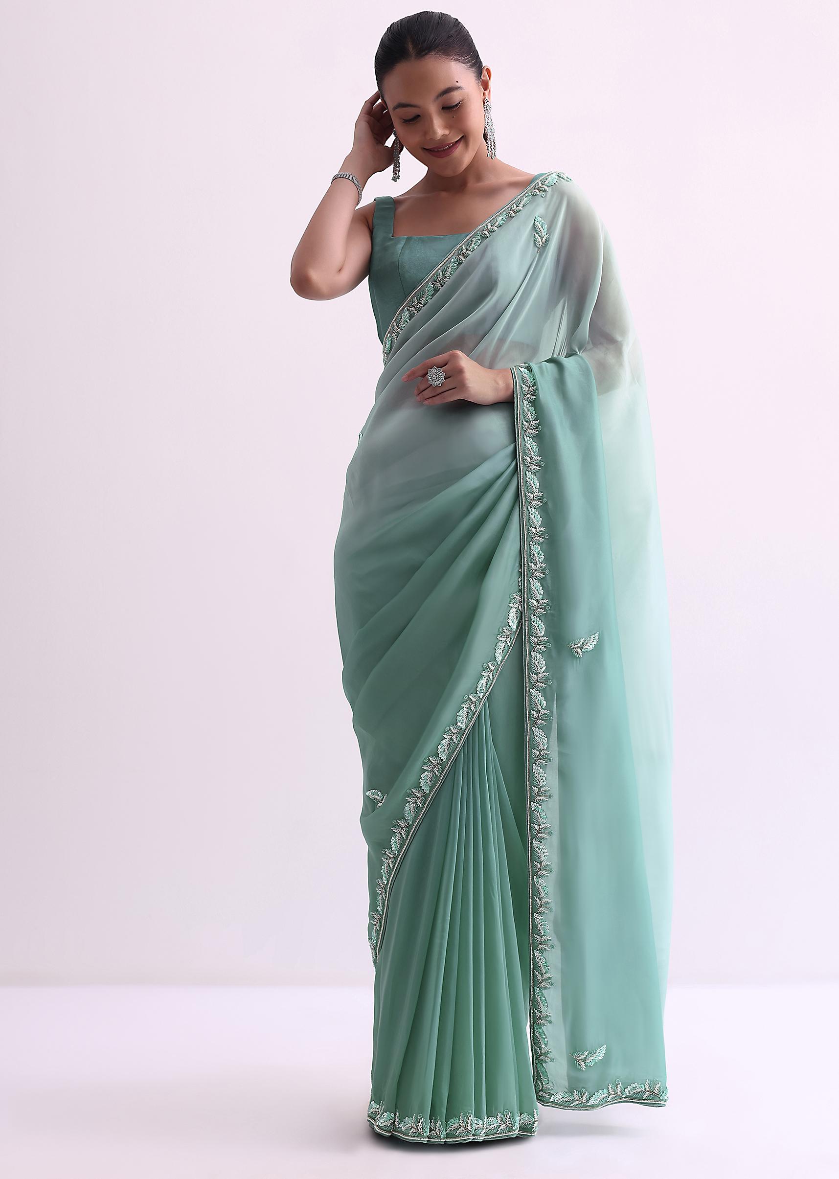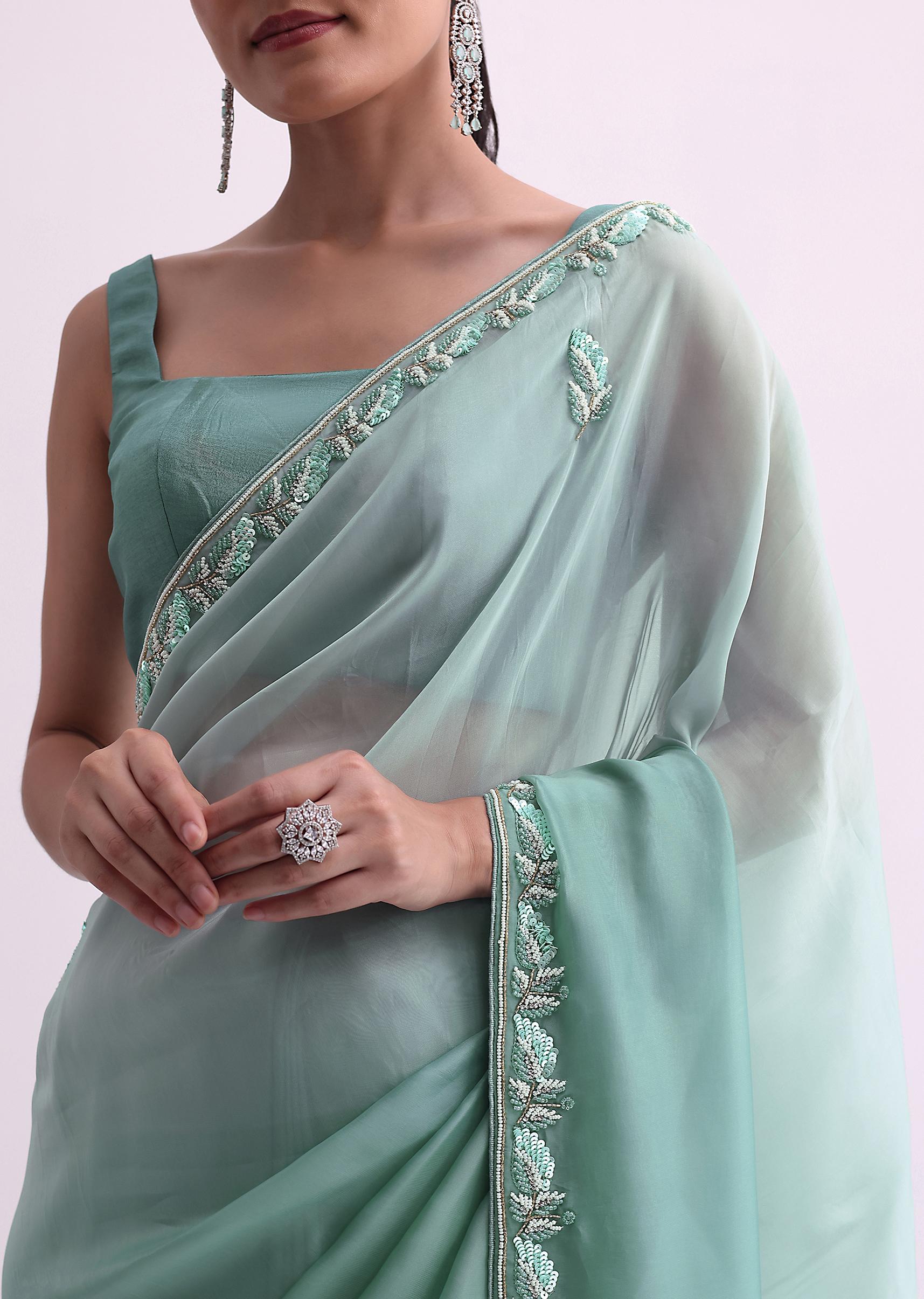 Sea Green Ombre Shaded Satin Saree With Sequin Border And Unstitched Blouse Fabric