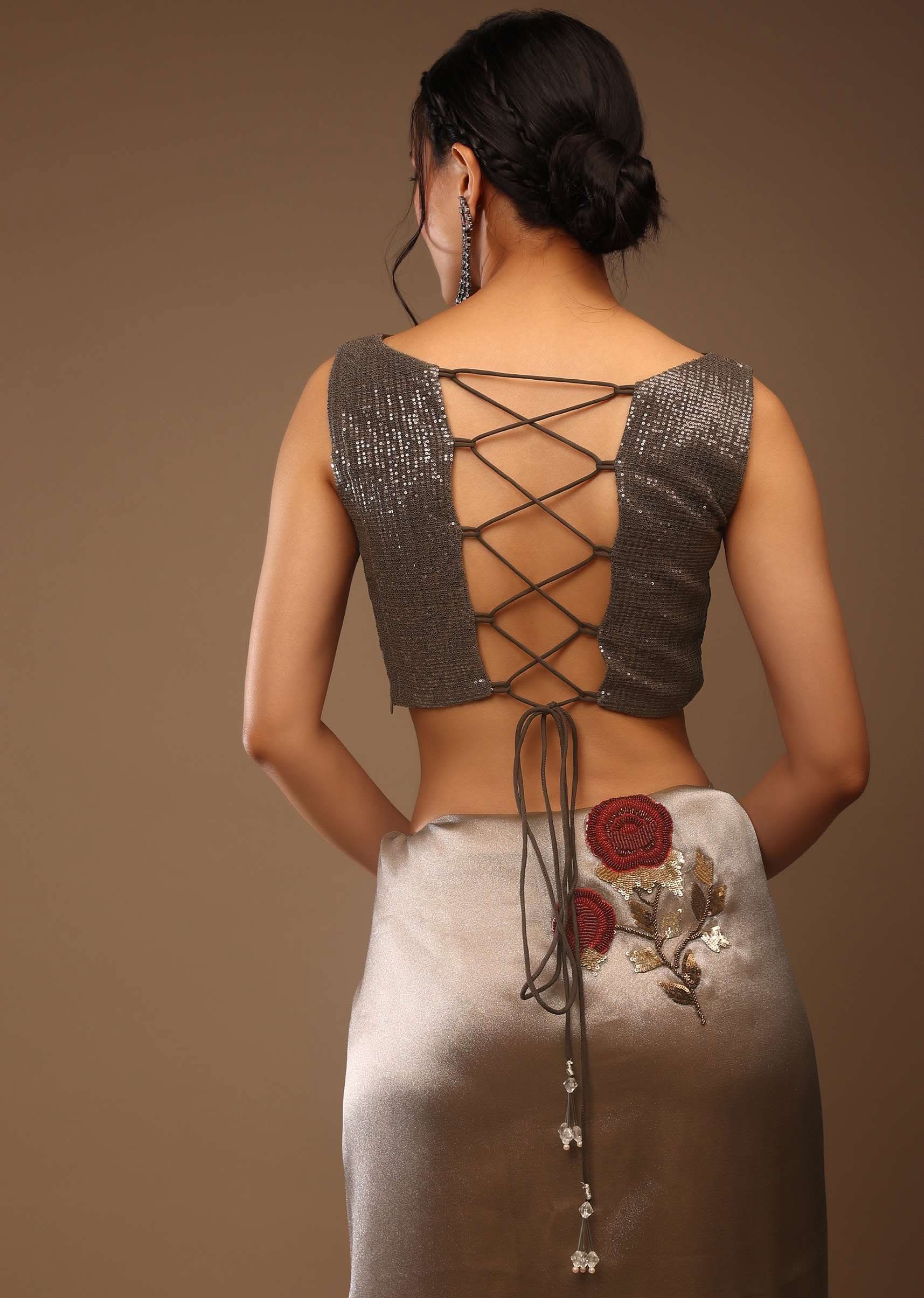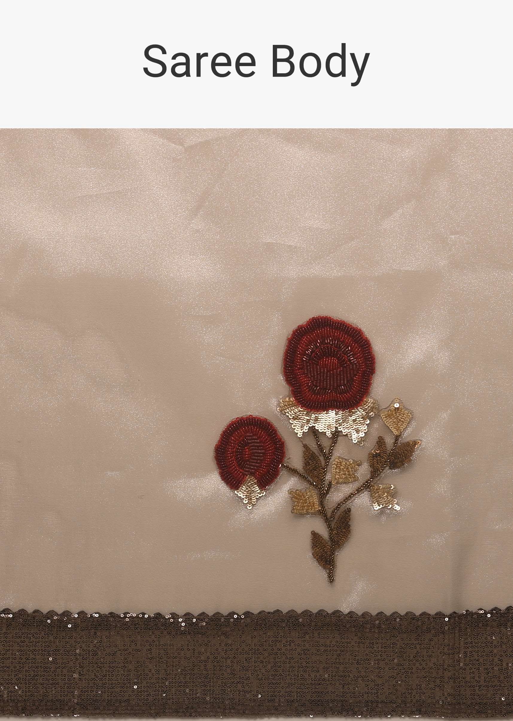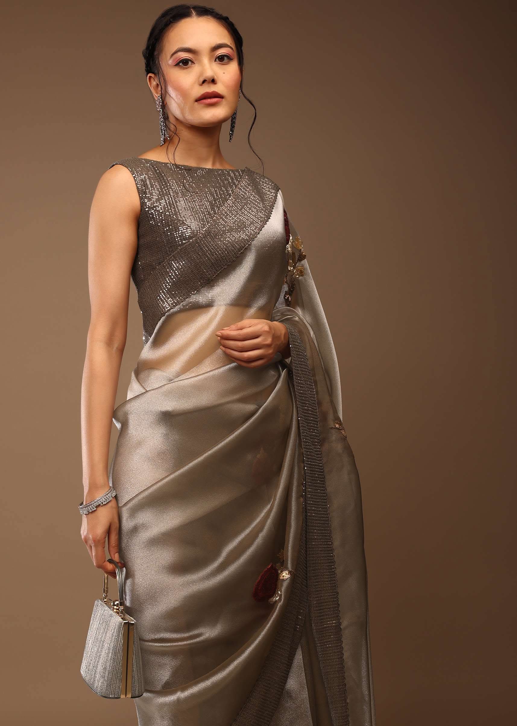 Silver And Cedar Brown Saree In Tissue Organza With Multi Colored Sequins Embroidered Motifs