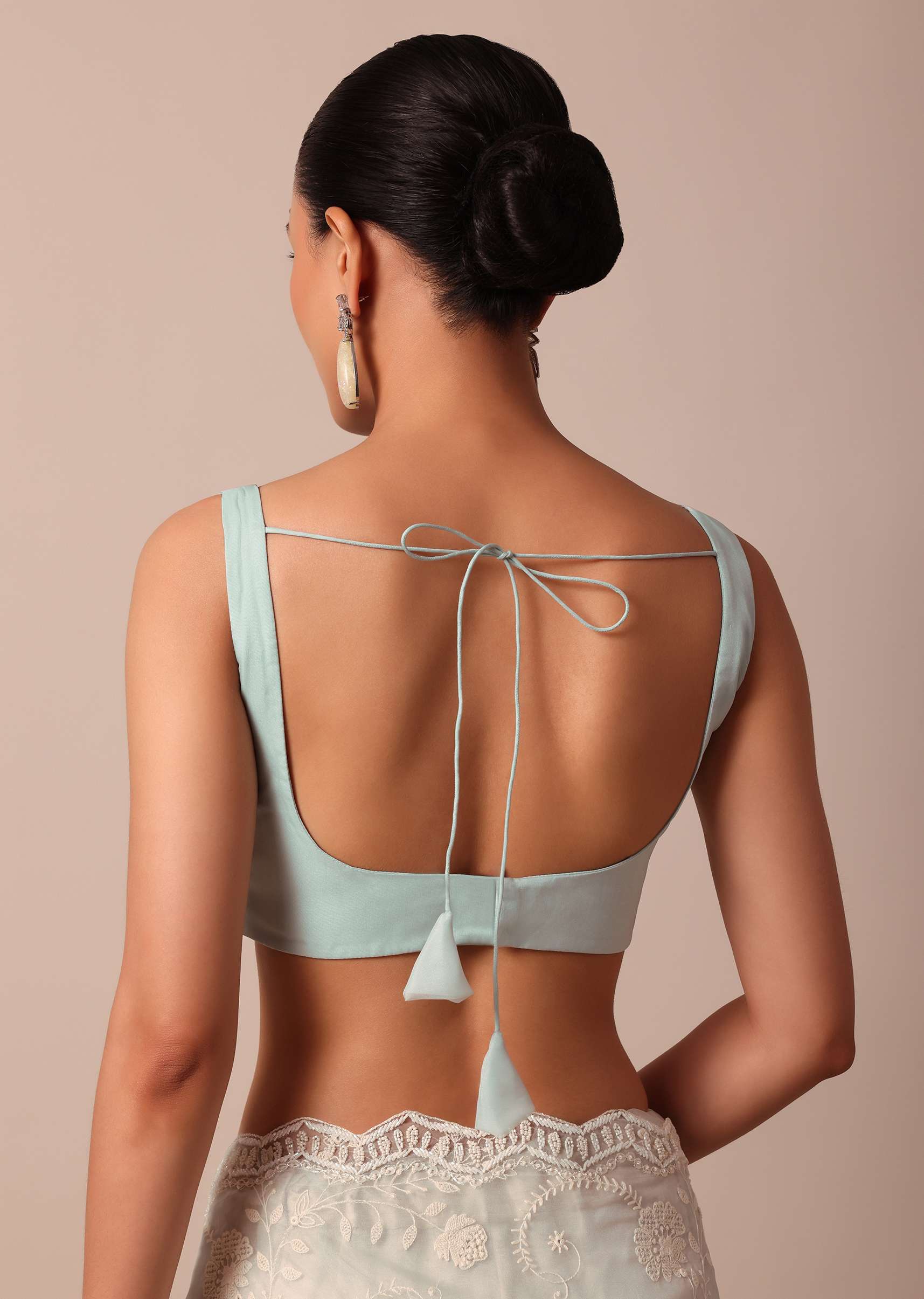 Sky Blue Chikankari Saree In Organza Silk With Scallop Border And Unstitched Blouse Fabric