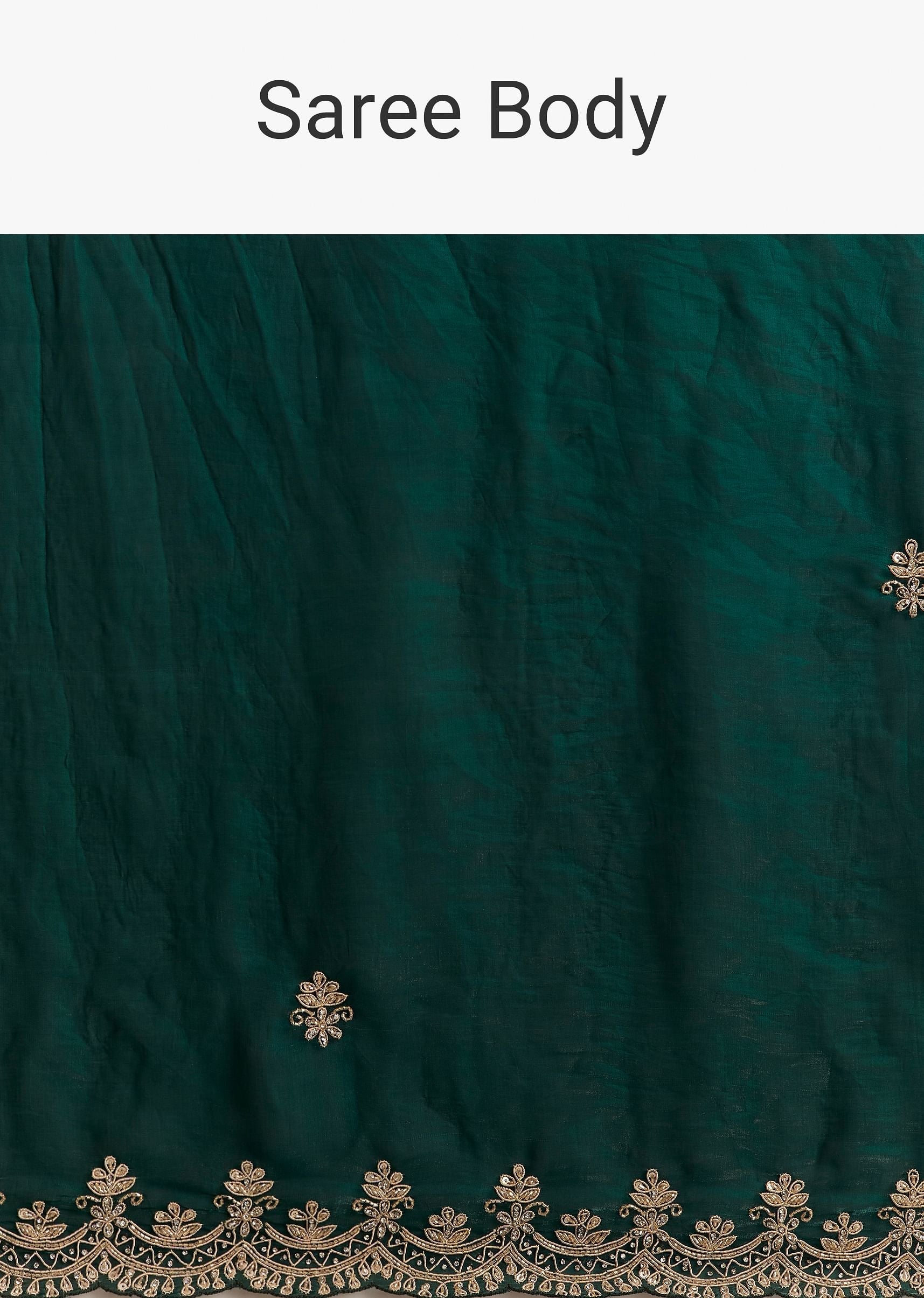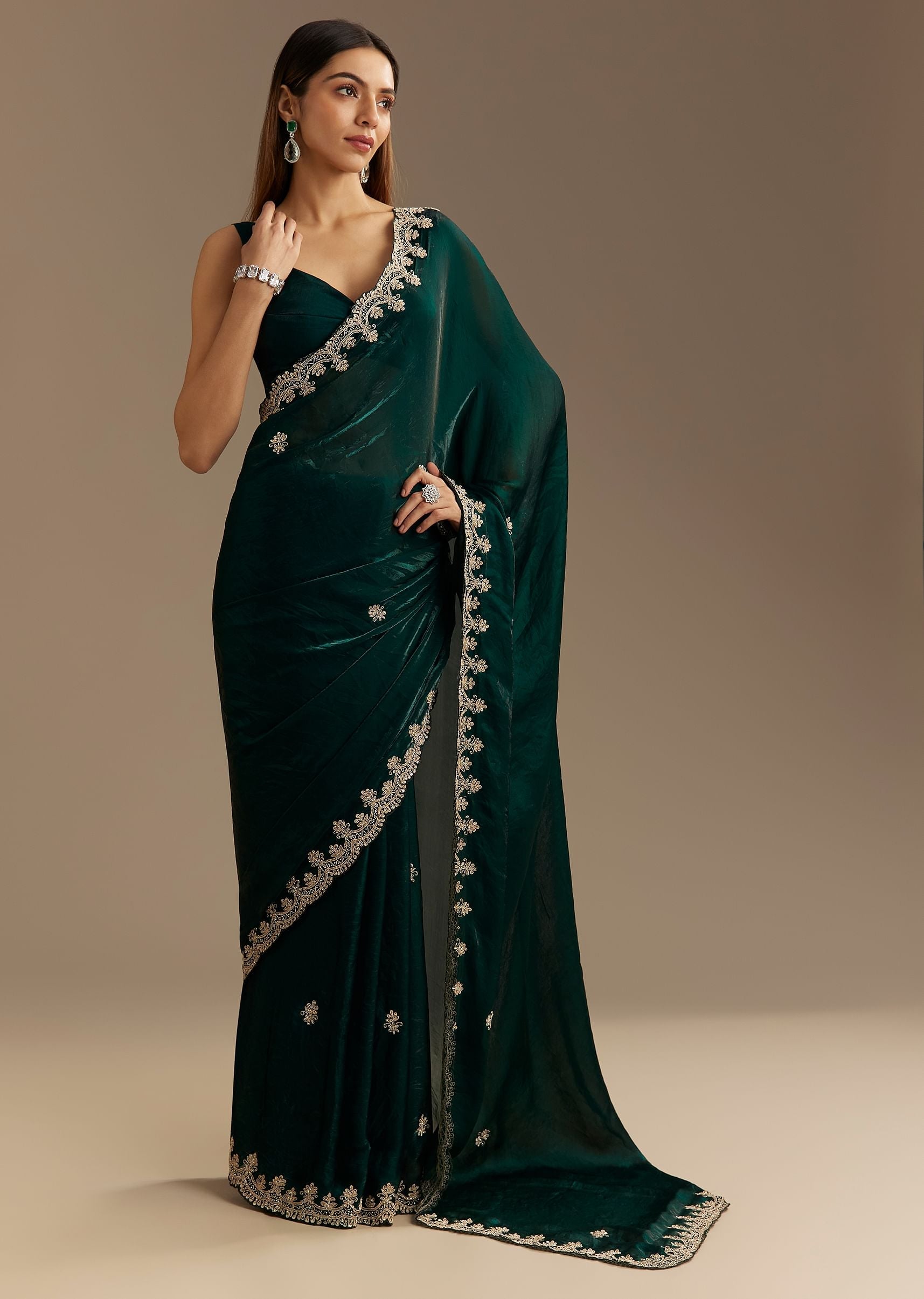 Teal Green Satin Saree With Zardosi Embroidery And Scallop Border