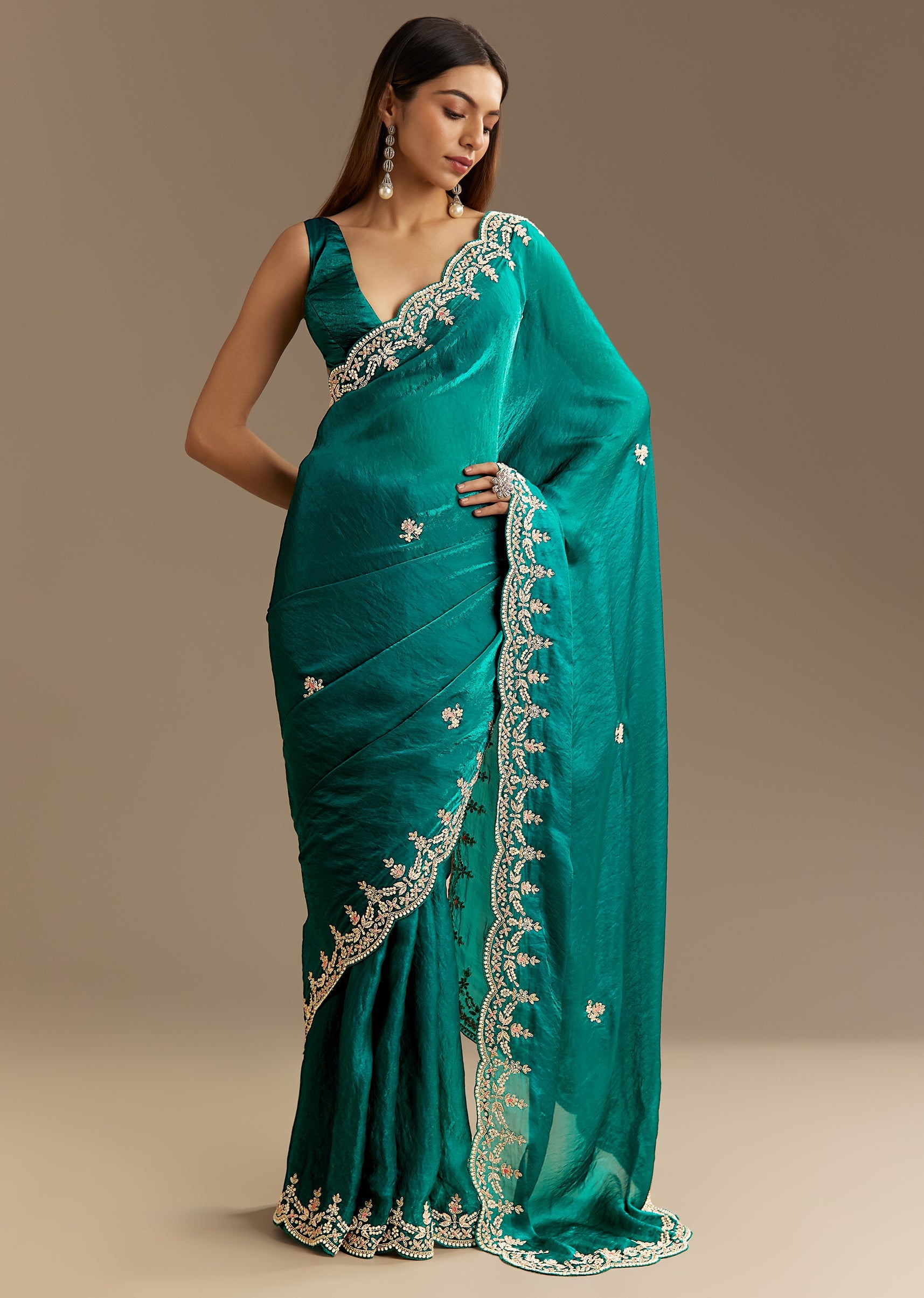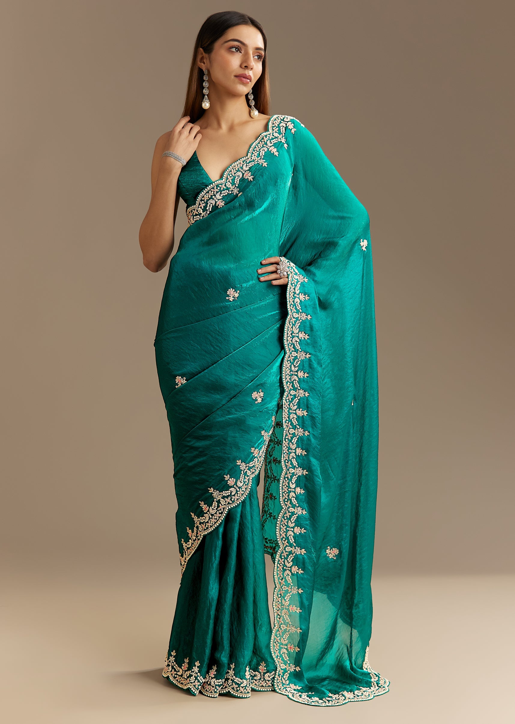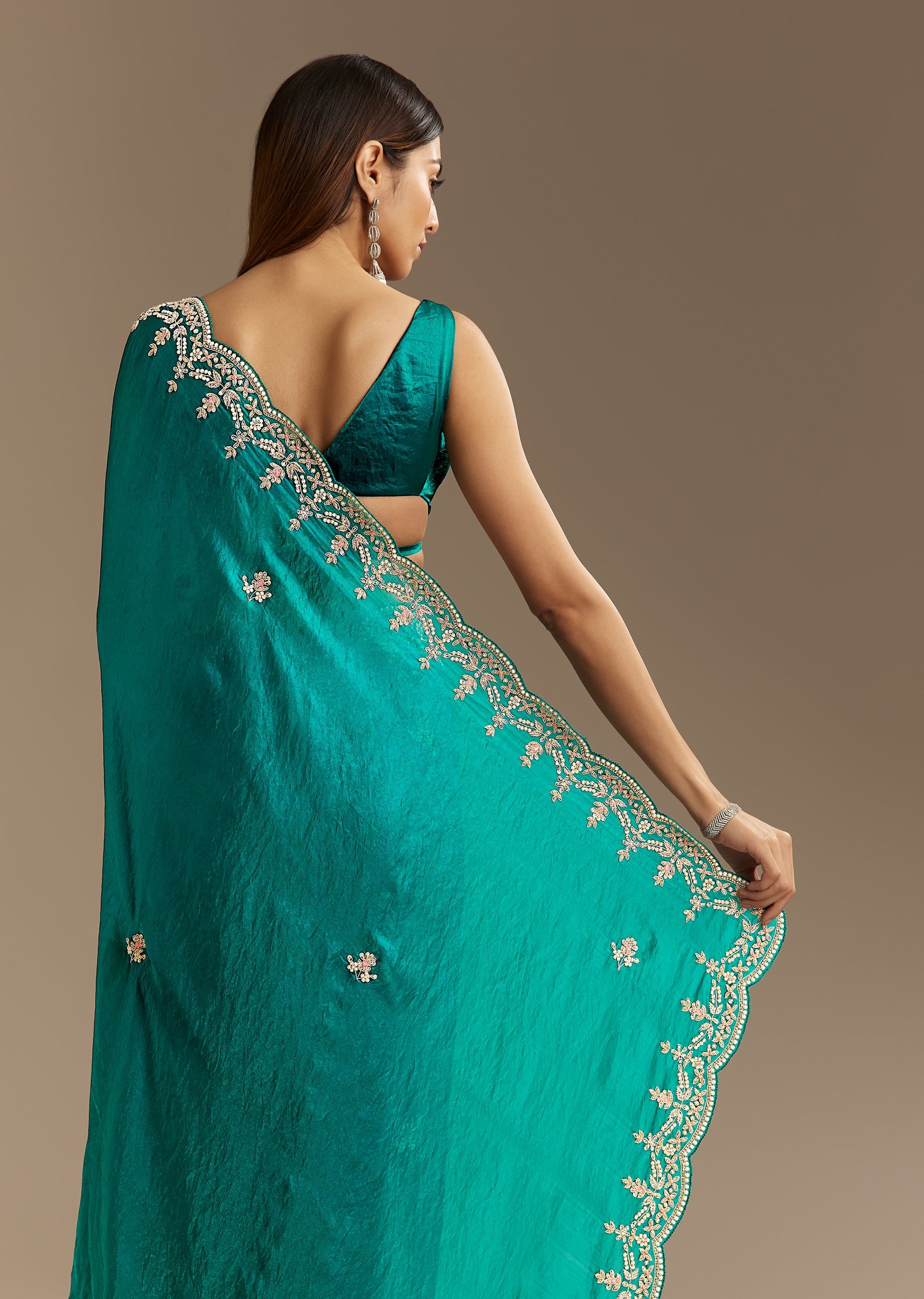 Teal Green Satin Saree With Zardosi Moti Embroidery And Scallop Border
