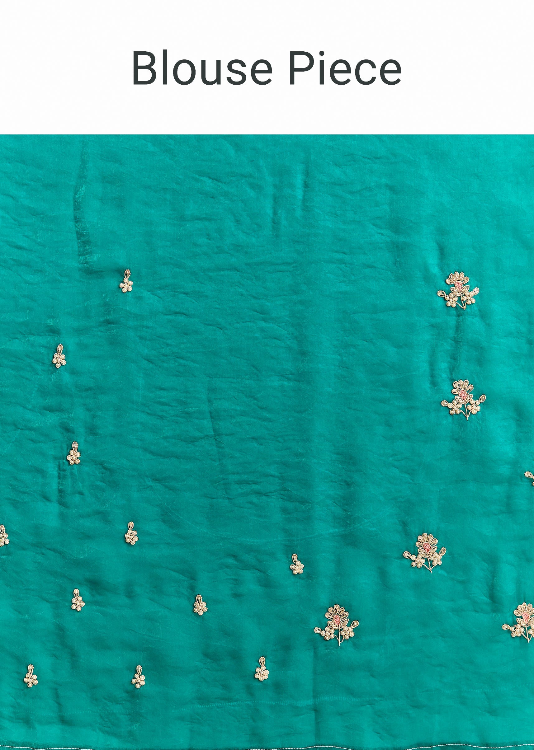 - Drape Yourself In Timeless Allure With This Teal Green Satin Saree Adorned With Exquisite Zardosi Moti Cutdana And Stone Embroidery.