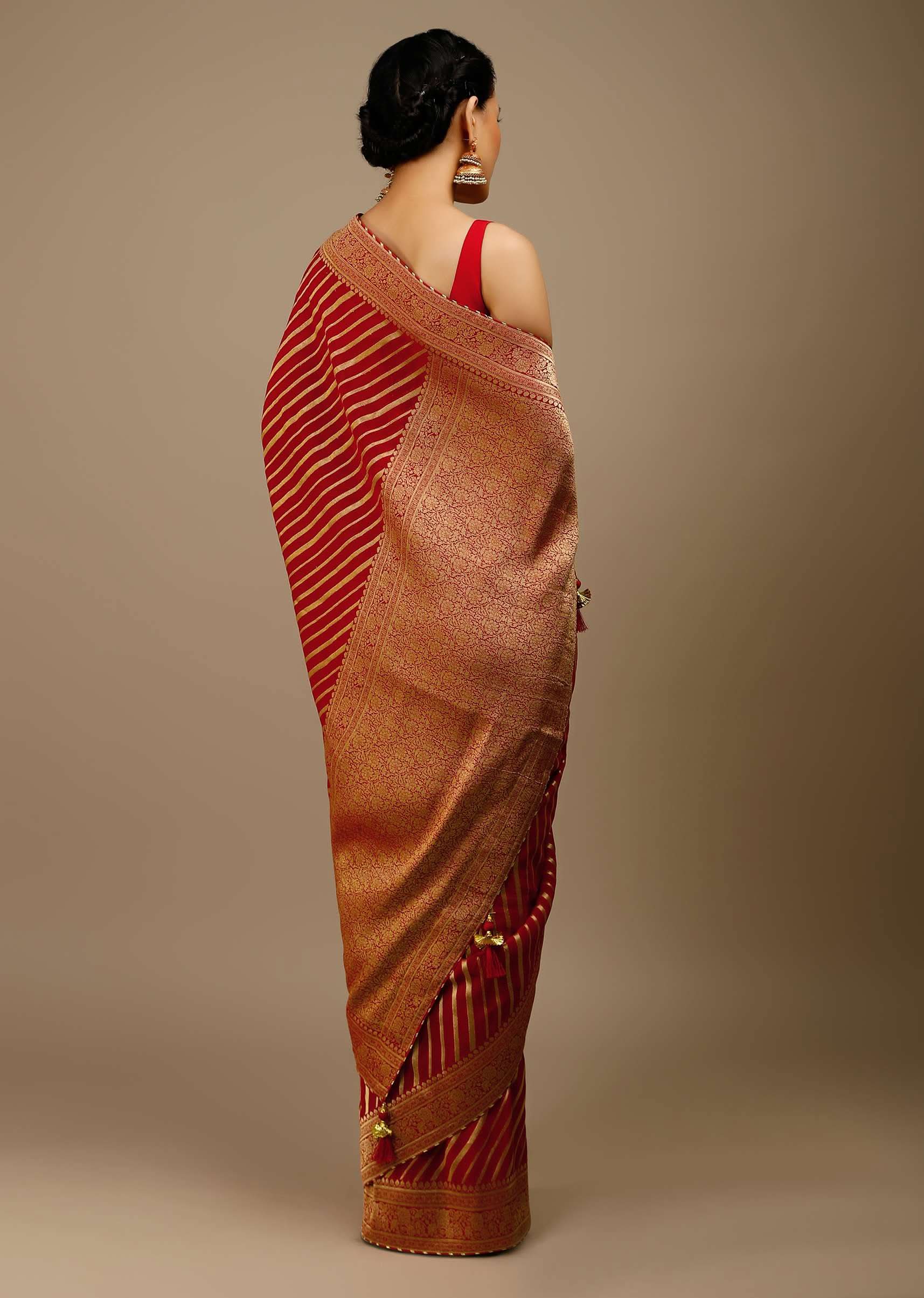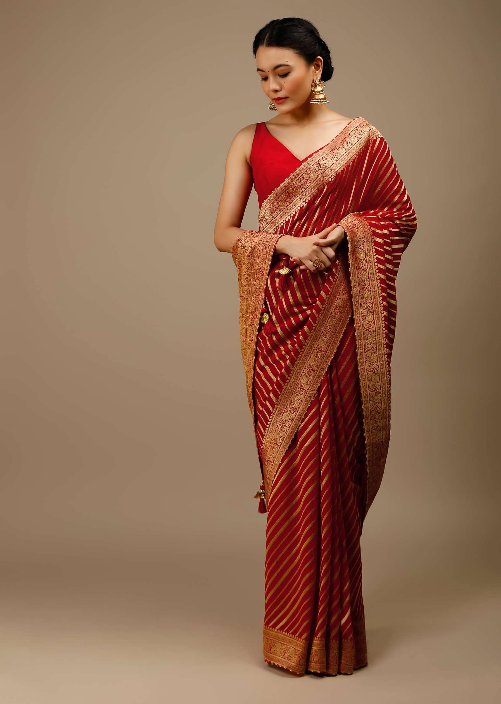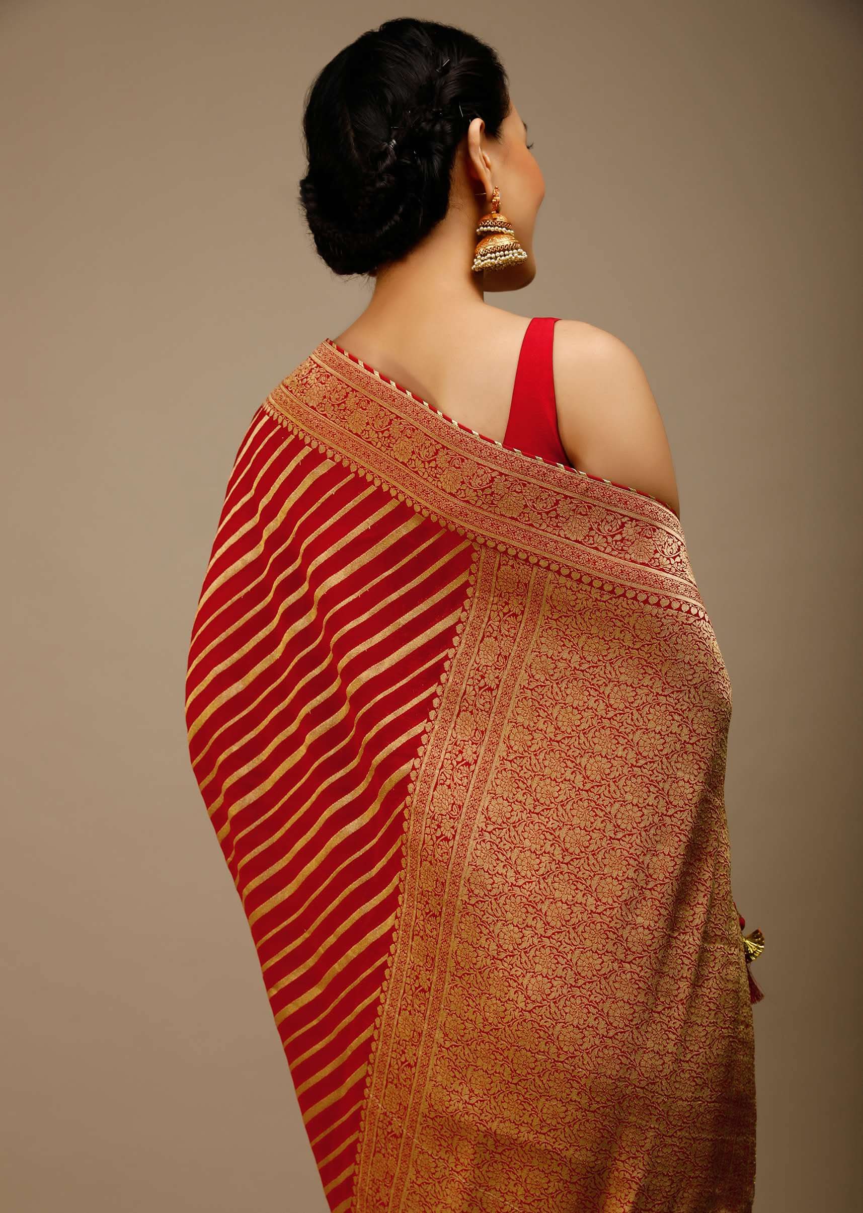 Tomato Red Saree In Georgette With Brocade Woven Diagonal Stripes And Floral Border
