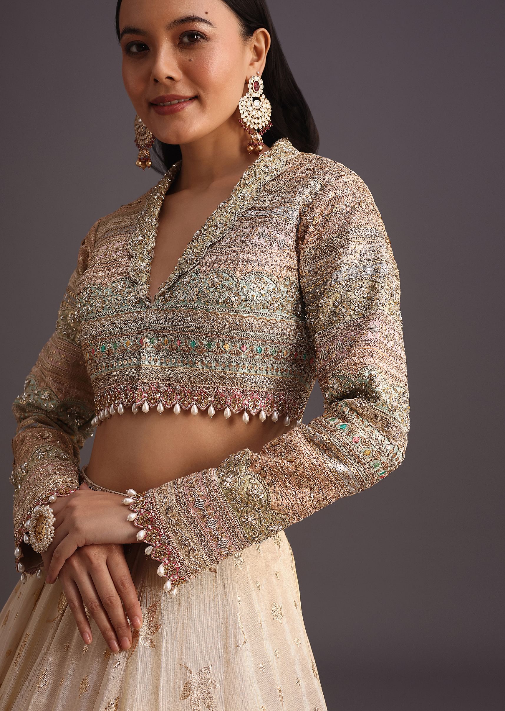 - The delicate gotta work choli, adorned with shimmering sequins pairs perfectly with the opulent Banarasi weave lehenga embellished with intricate zari embroidery.