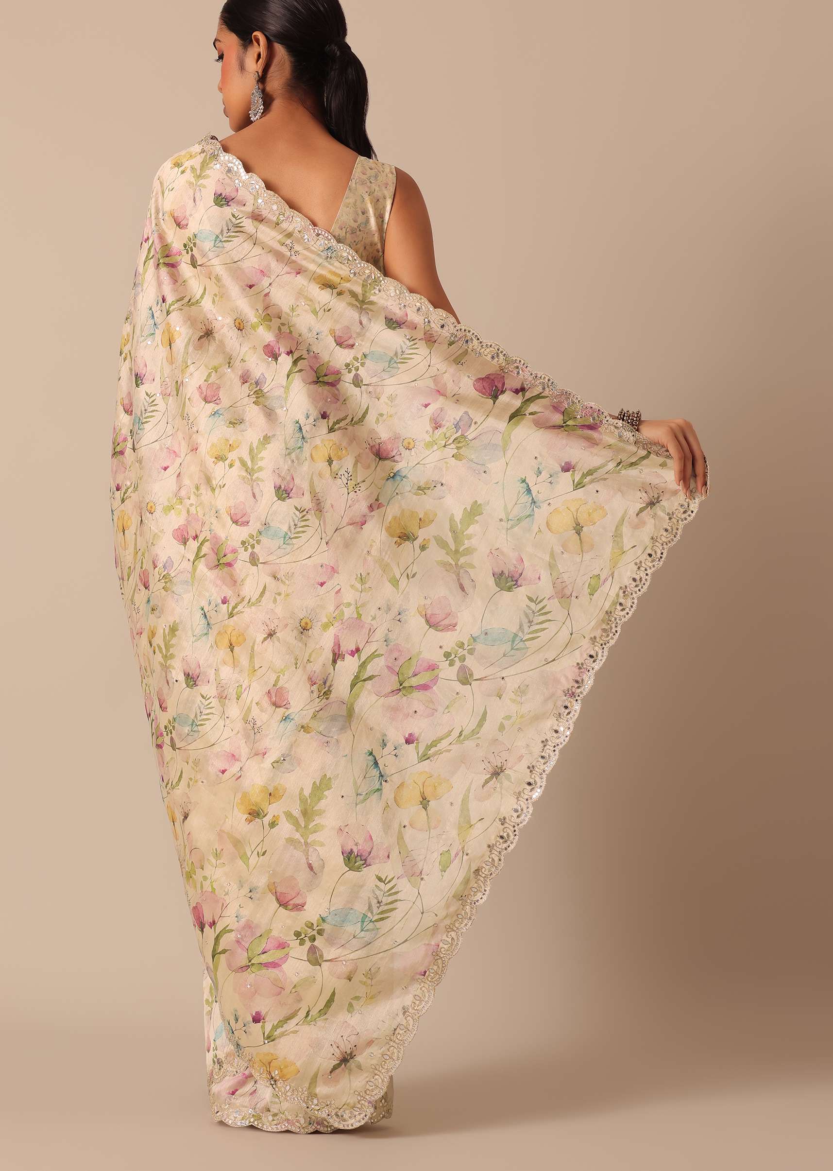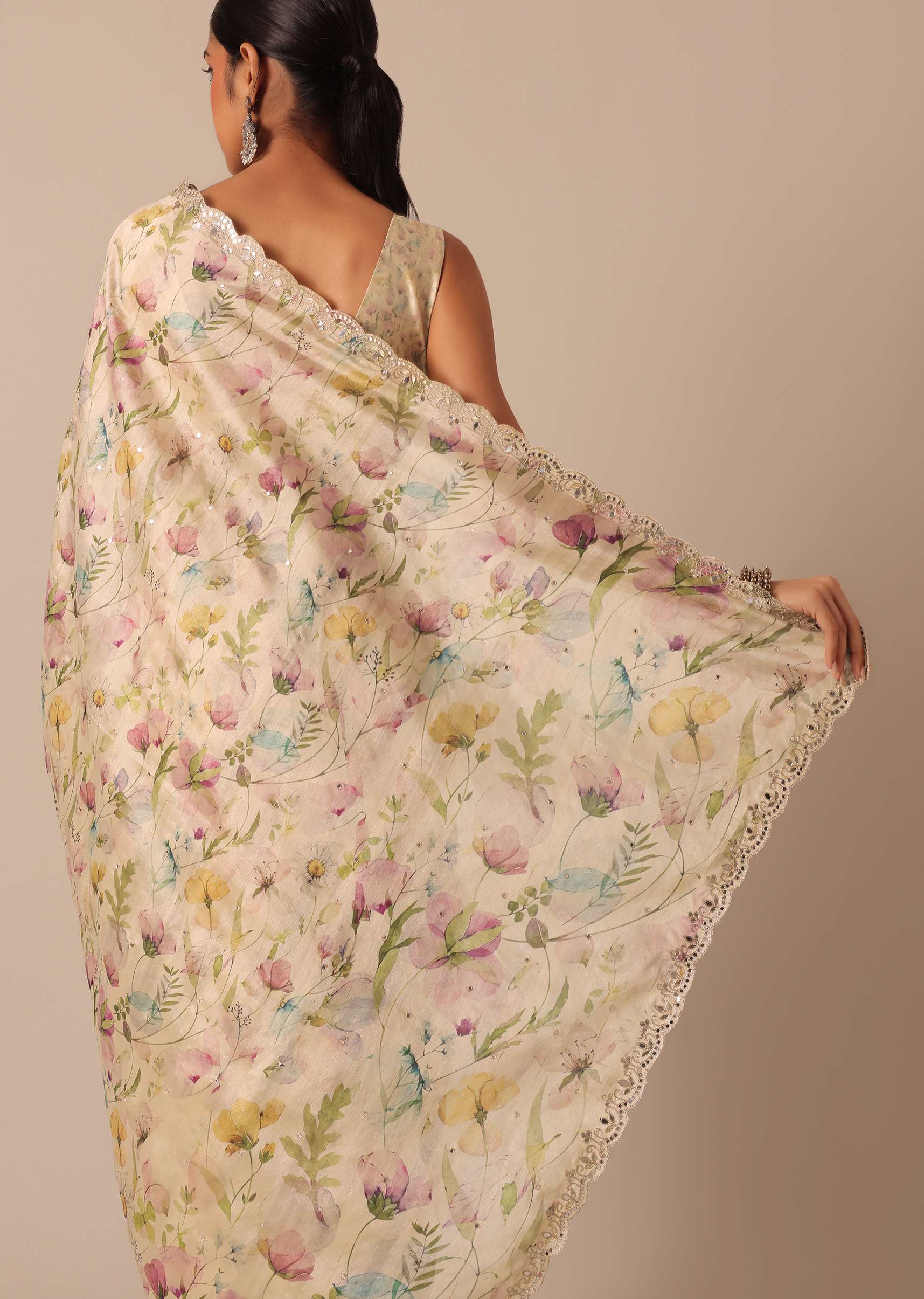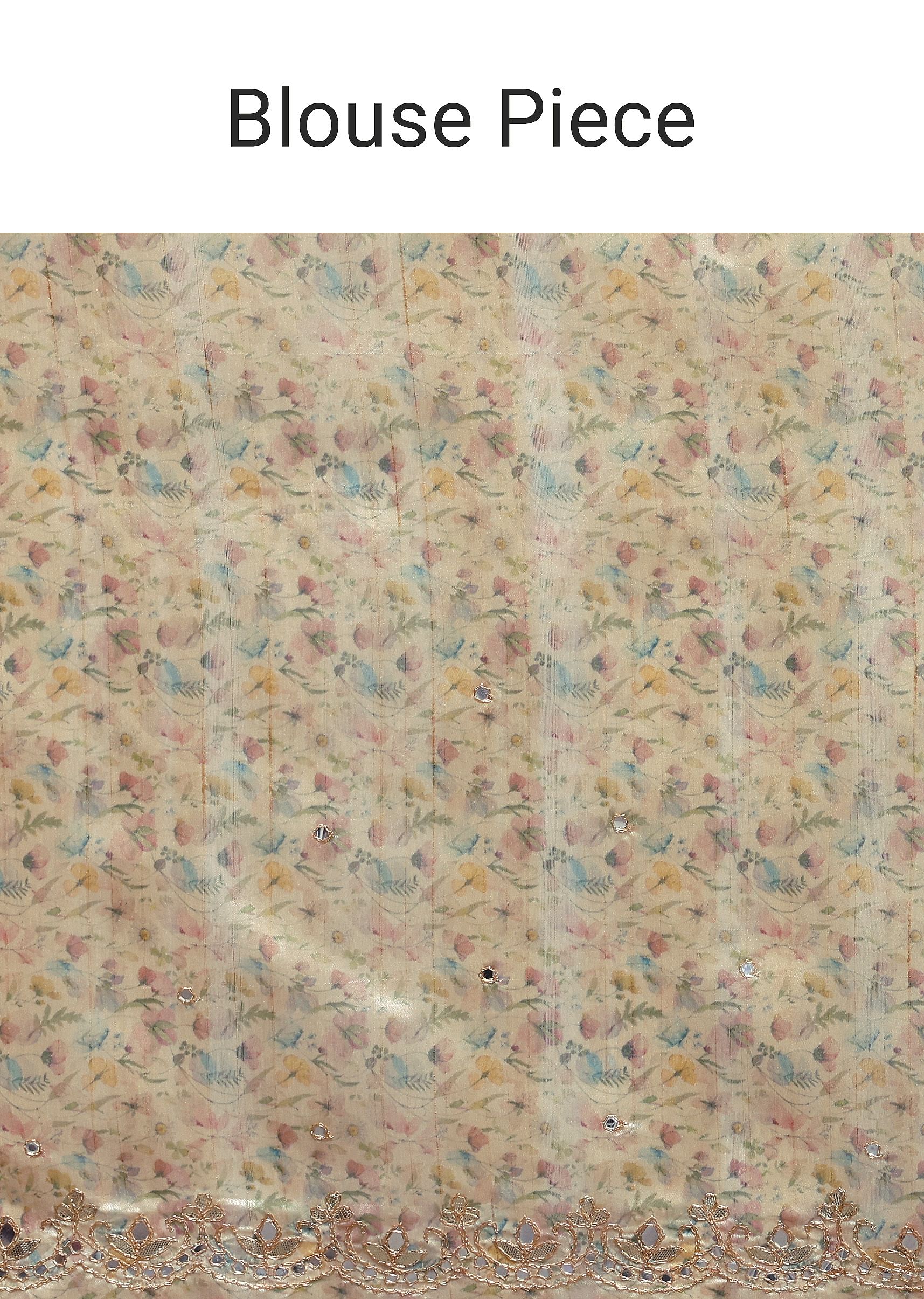An effortless way to make a fashionable impact this festive season is by stepping out in this stunning white saree Showcasing a rich tussar silk fabric prettified with multicolor floral prints. The cutwork scallop border is further enhanced with glimmering mirrors for a standout look. Paired with an unstitched blouse piece this saree ensures a stunning look.WASH CARE INSTRUCTIONS. Blouse work may vary. Awarded As The Most Trusted Brand We'Re Delivering Styles You Love Just As Promised.