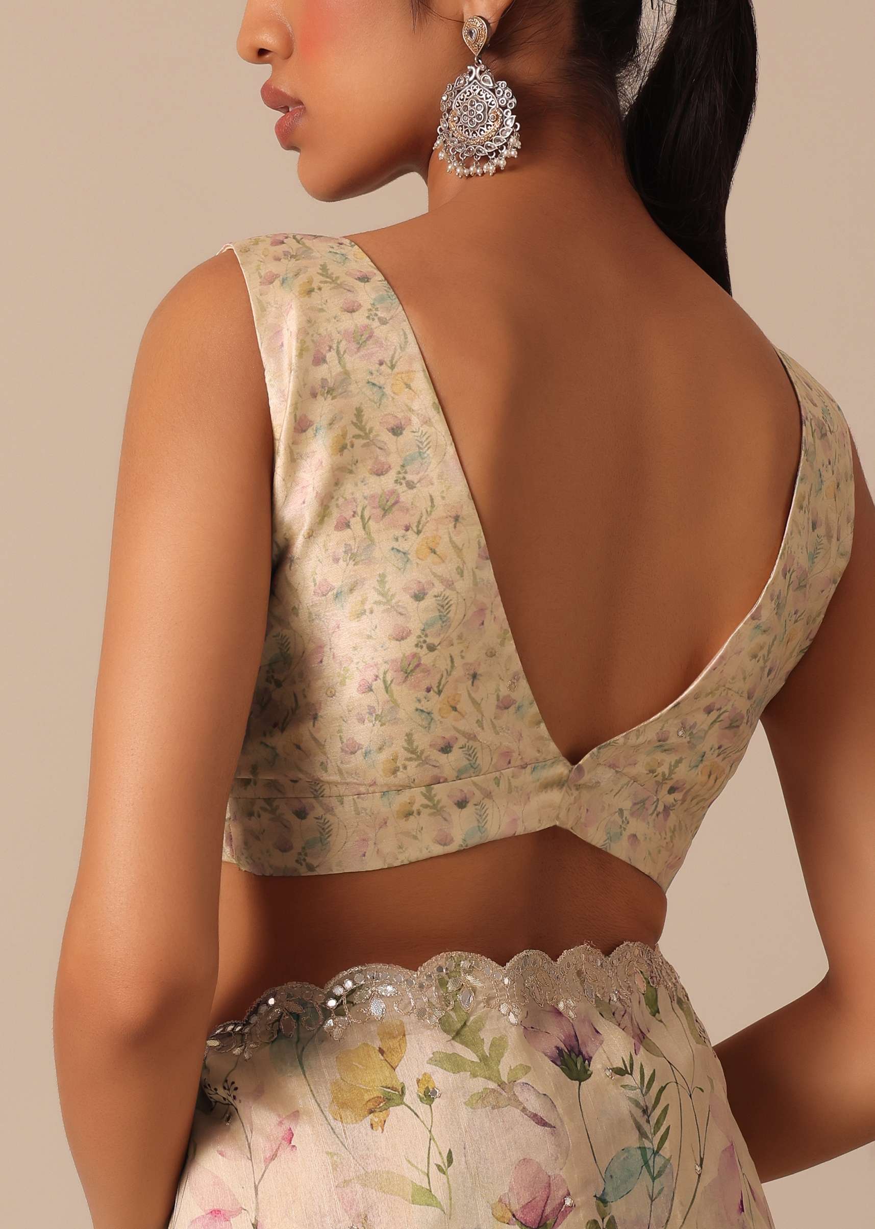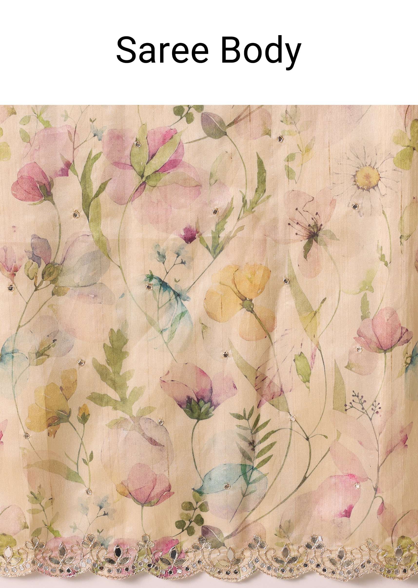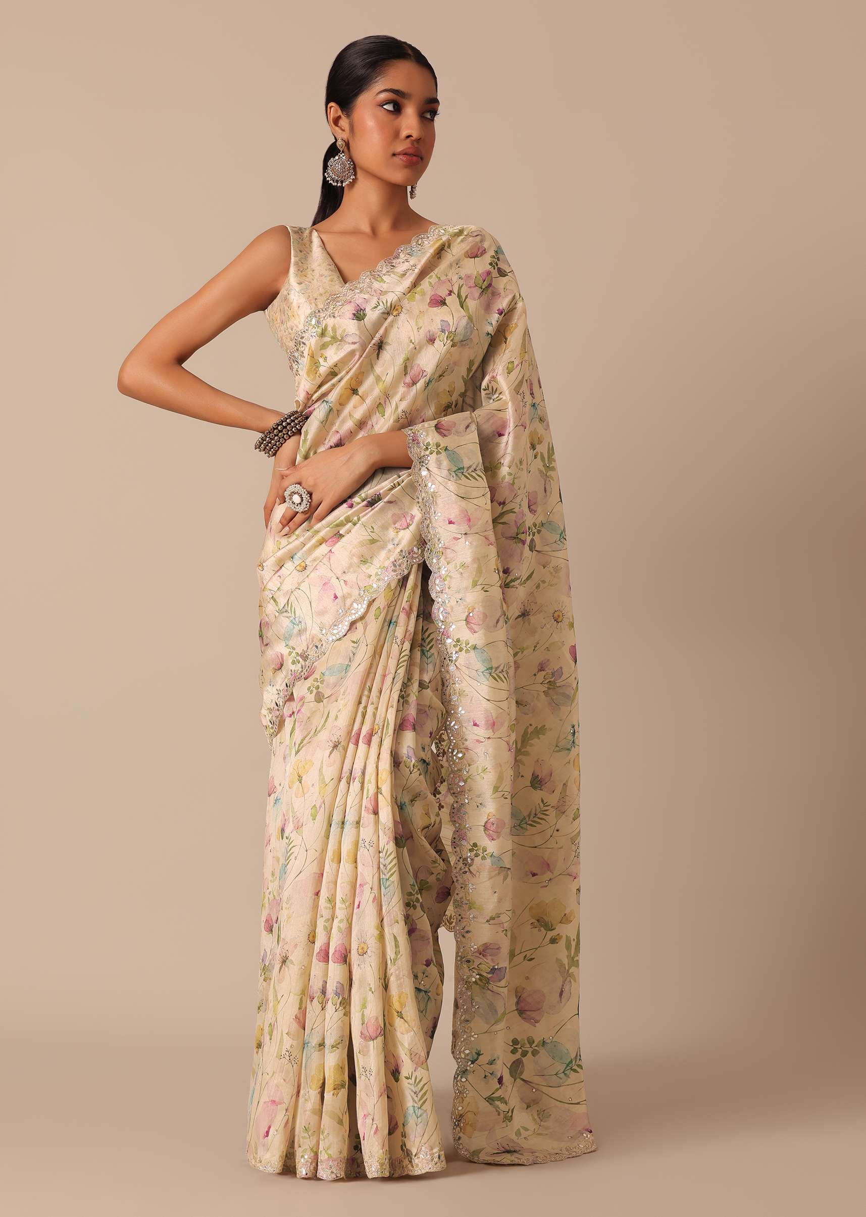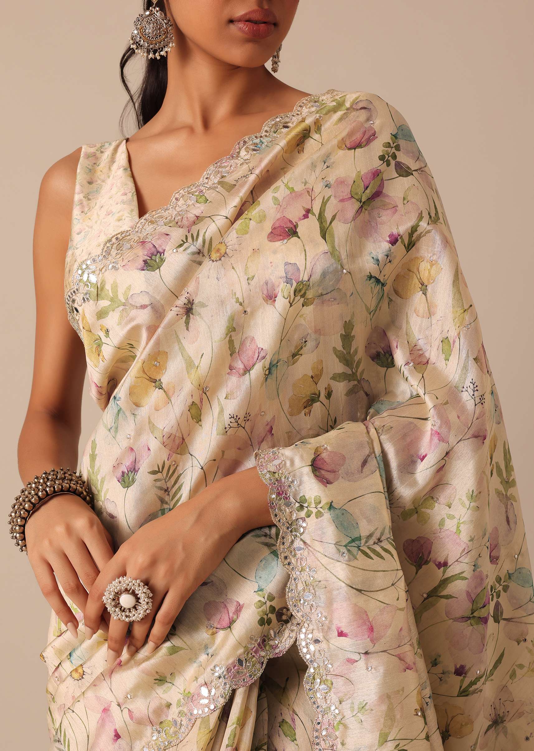 An effortless way to make a fashionable impact this festive season is by stepping out in this stunning white saree Showcasing a rich tussar silk fabric prettified with multicolor floral prints. The cutwork scallop border is further enhanced with glimmering mirrors for a standout look. Paired with an unstitched blouse piece this saree ensures a stunning look.WASH CARE INSTRUCTIONS. Blouse work may vary. Awarded As The Most Trusted Brand We'Re Delivering Styles You Love Just As Promised.