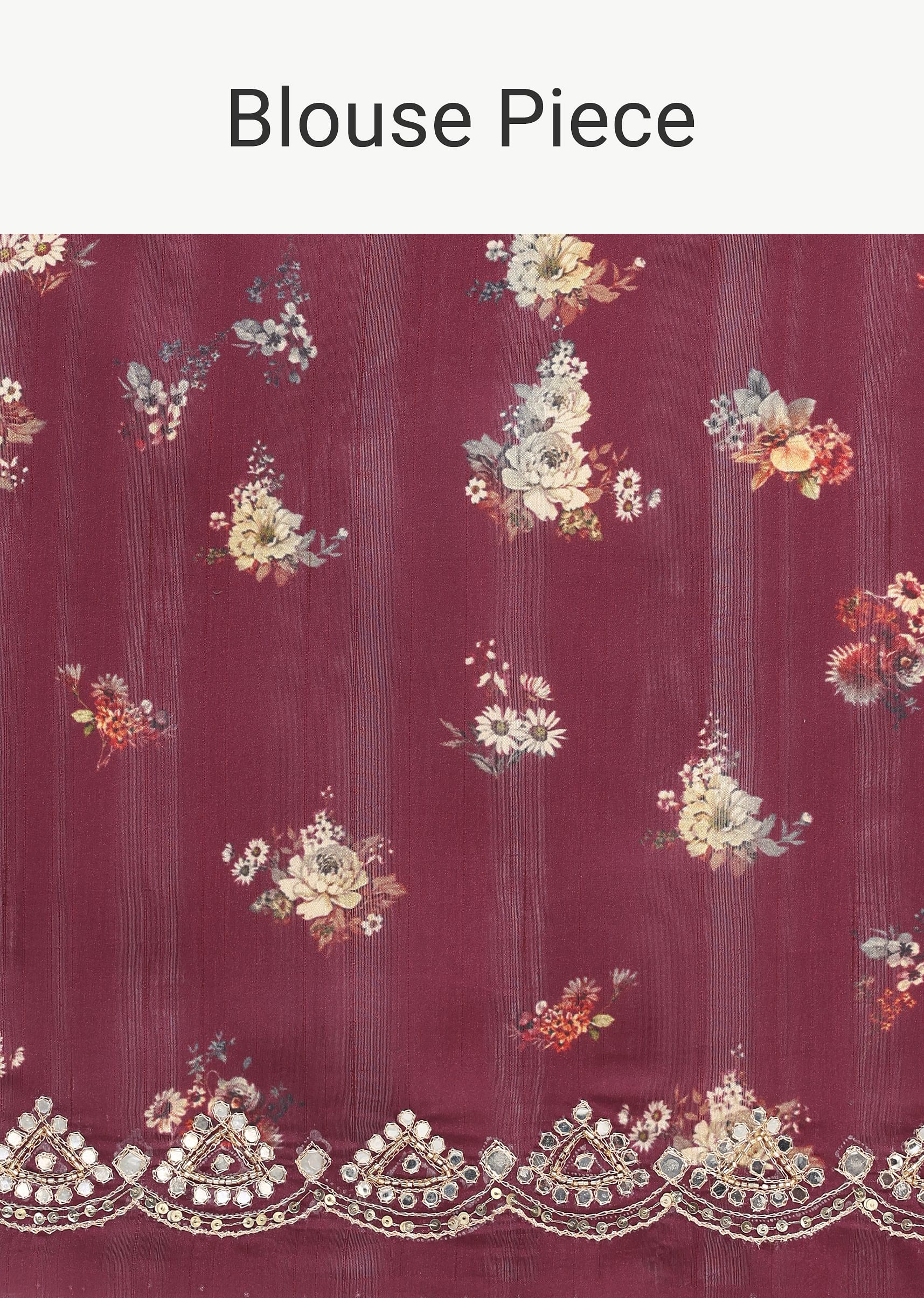 Wine Printed Tussar Silk Saree With Unstitched Blouse Piece
