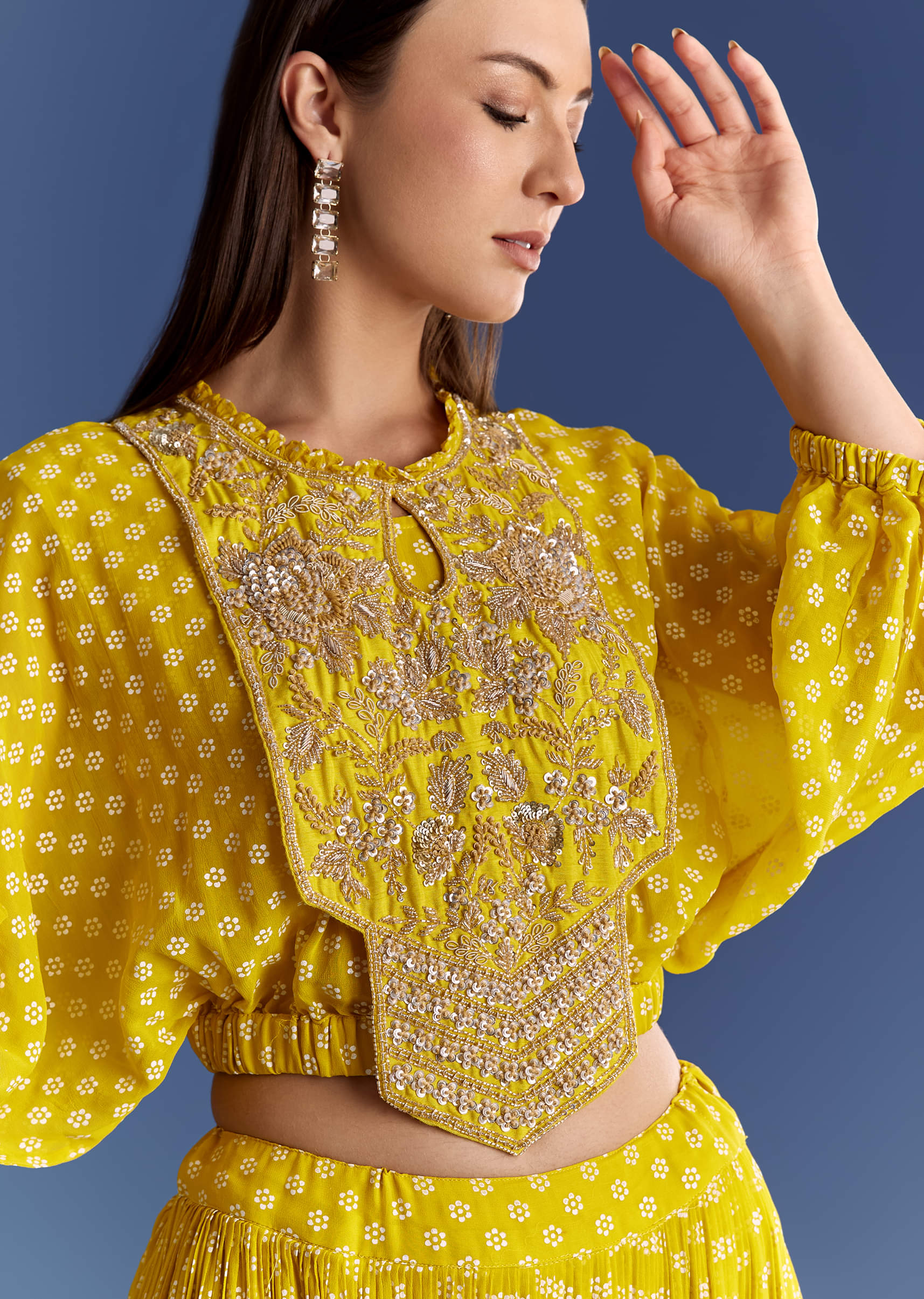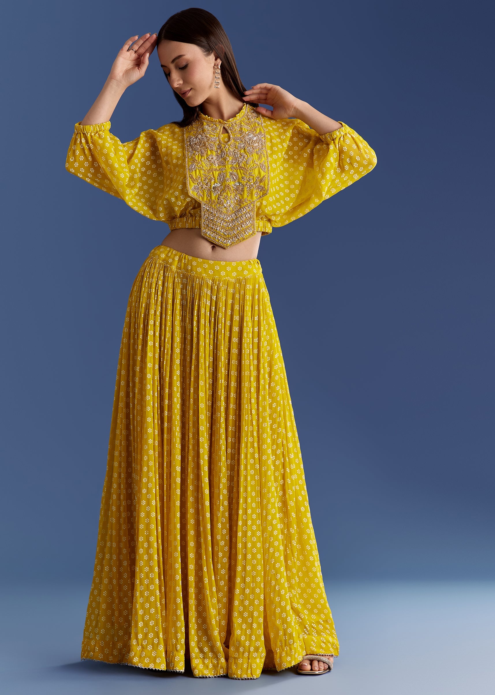 Yellow Floral Georgette Lehenga Set With Zardosi Croptop