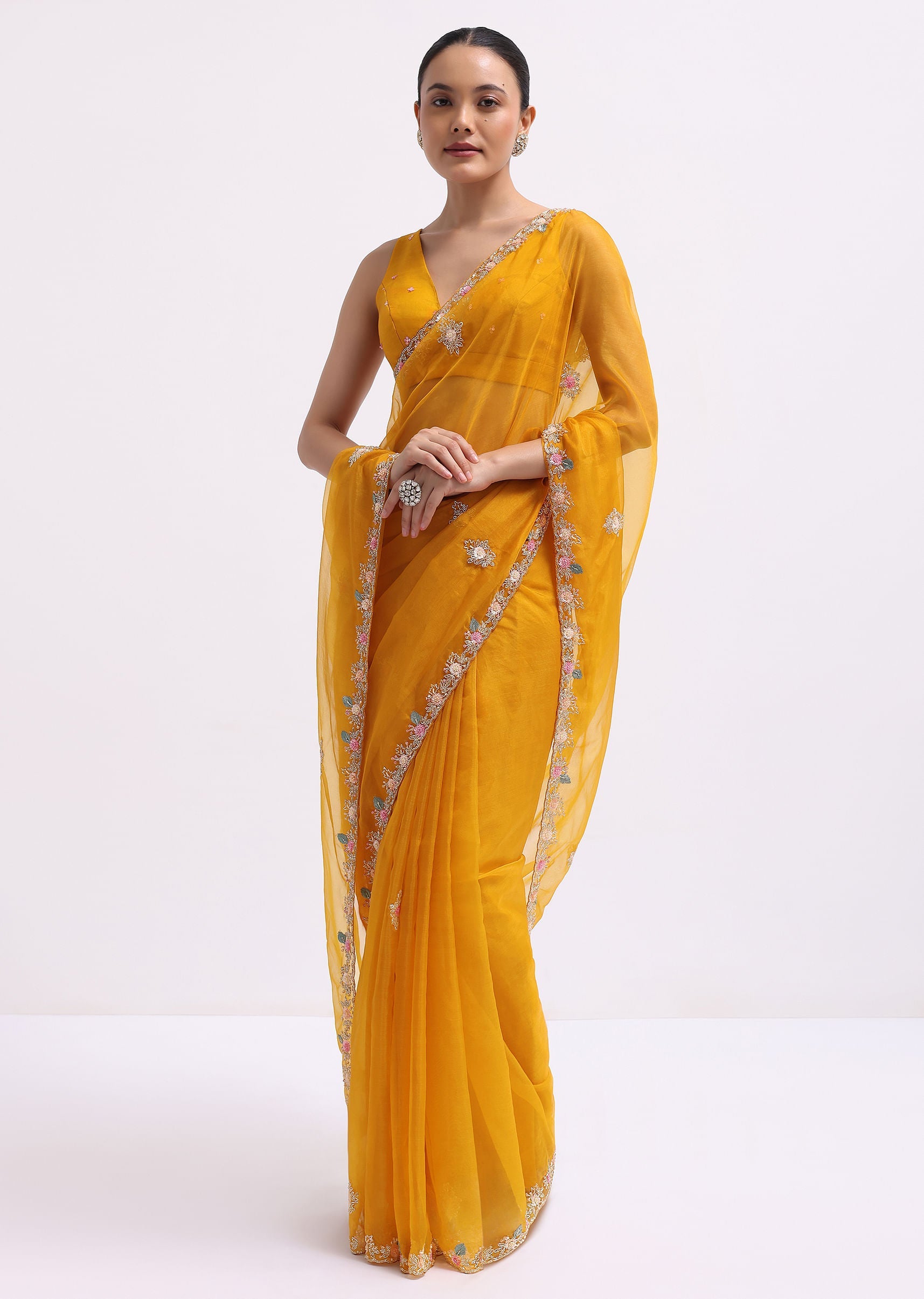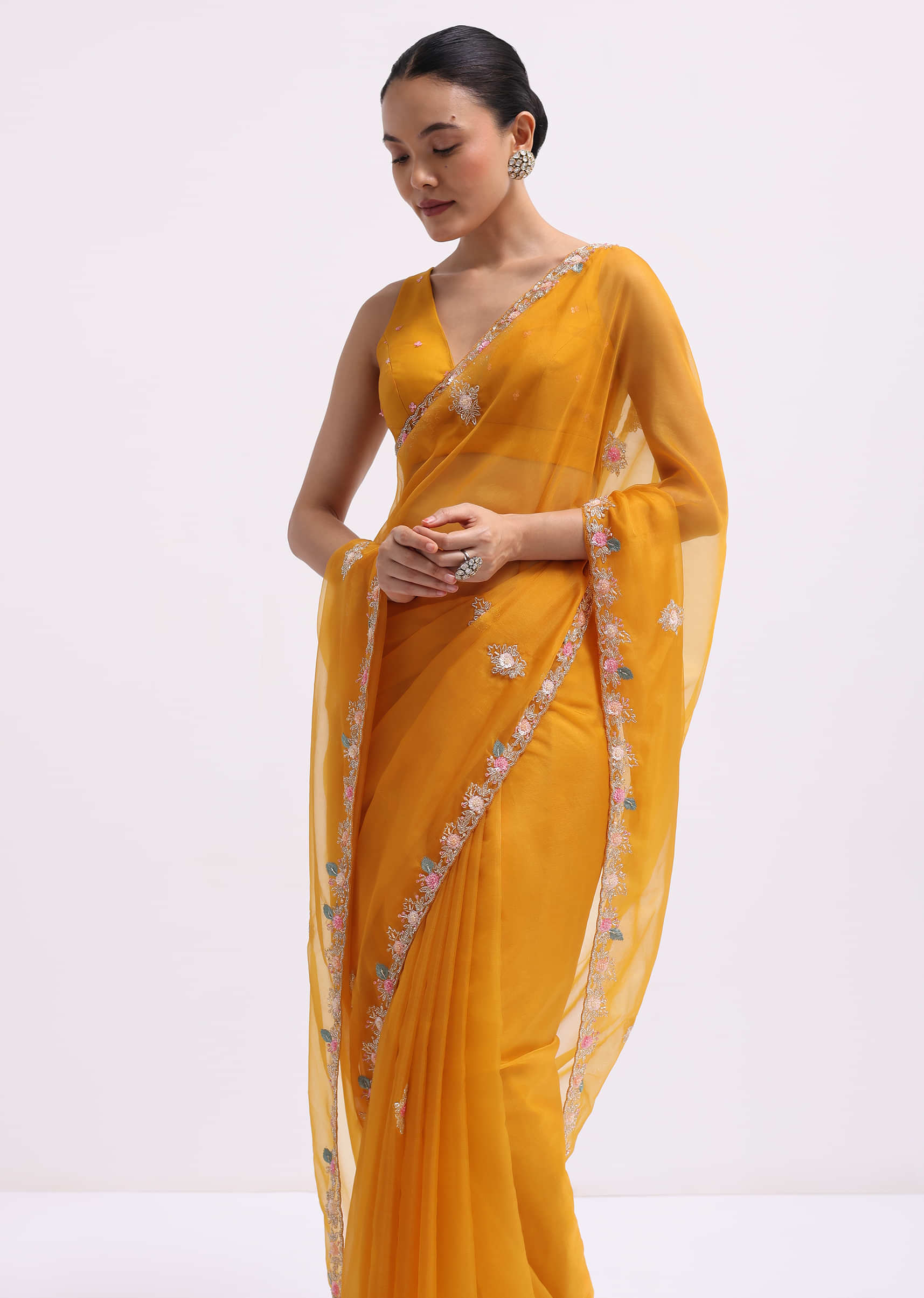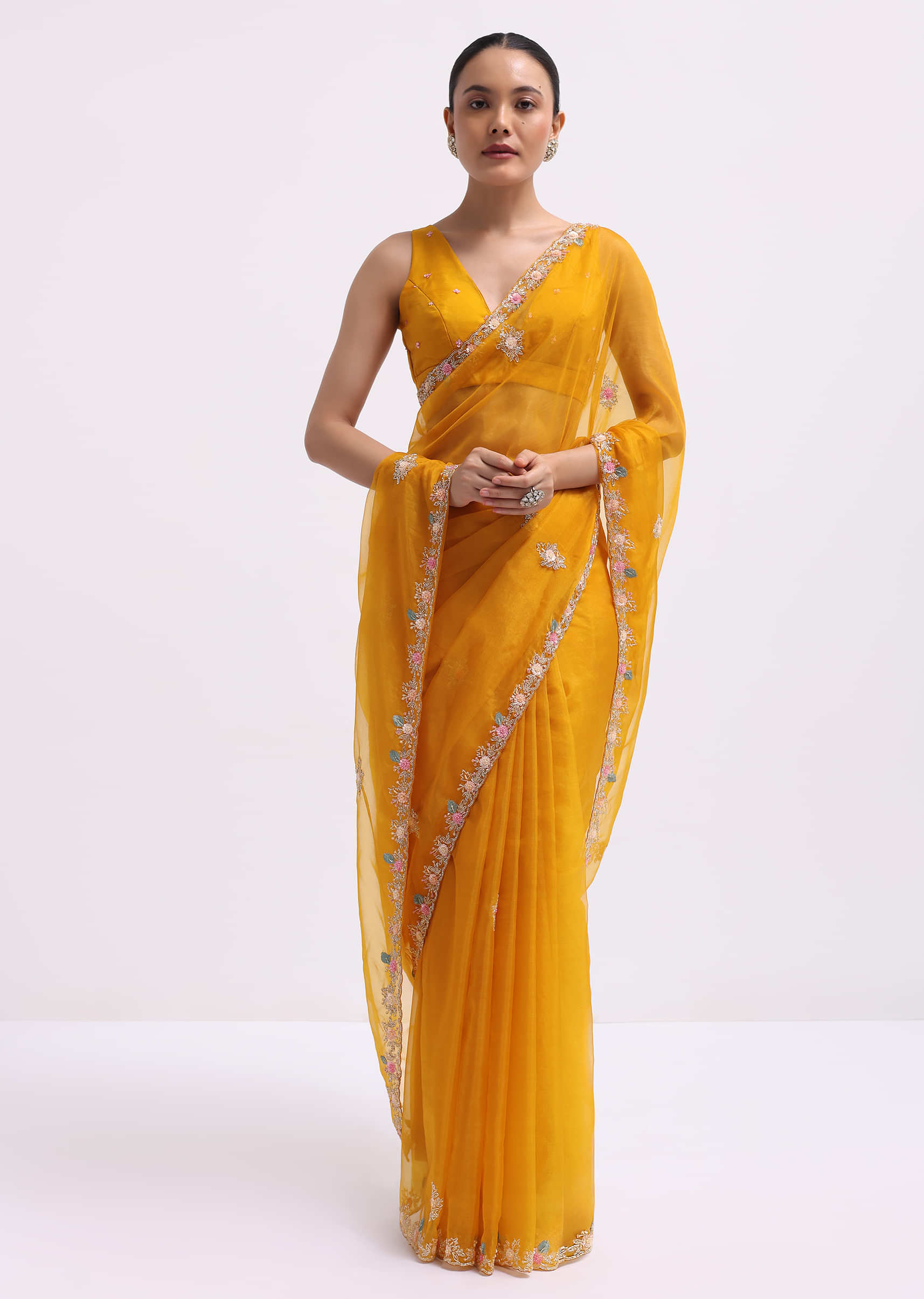 - Fashioned from indulgent organza fabric and embellished with detailed 3D sequined floral embroidery and a cutdana scallop border, this ensemble radiates sophistication and opulence.