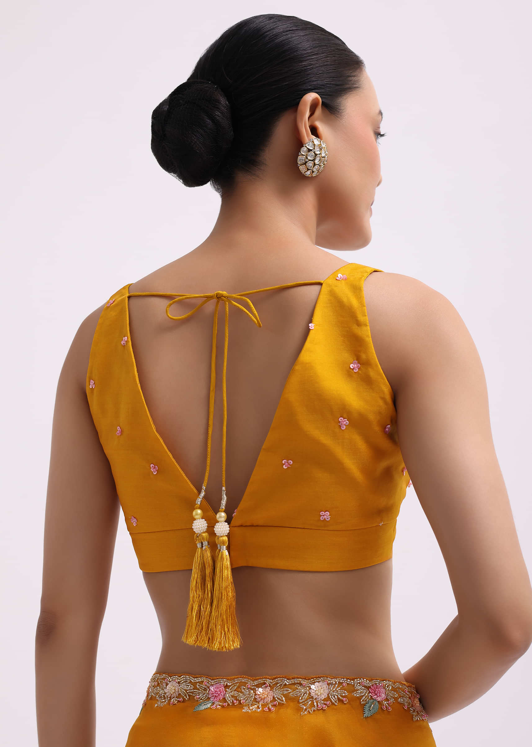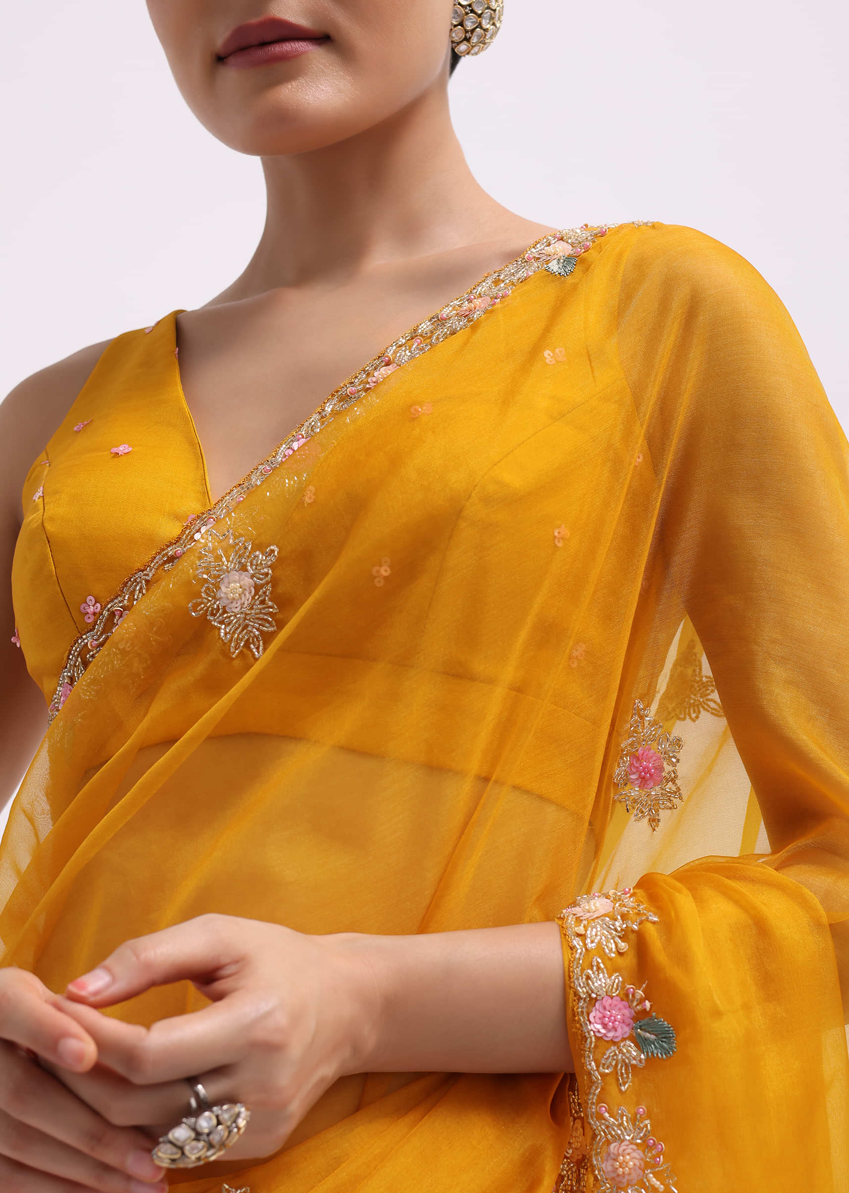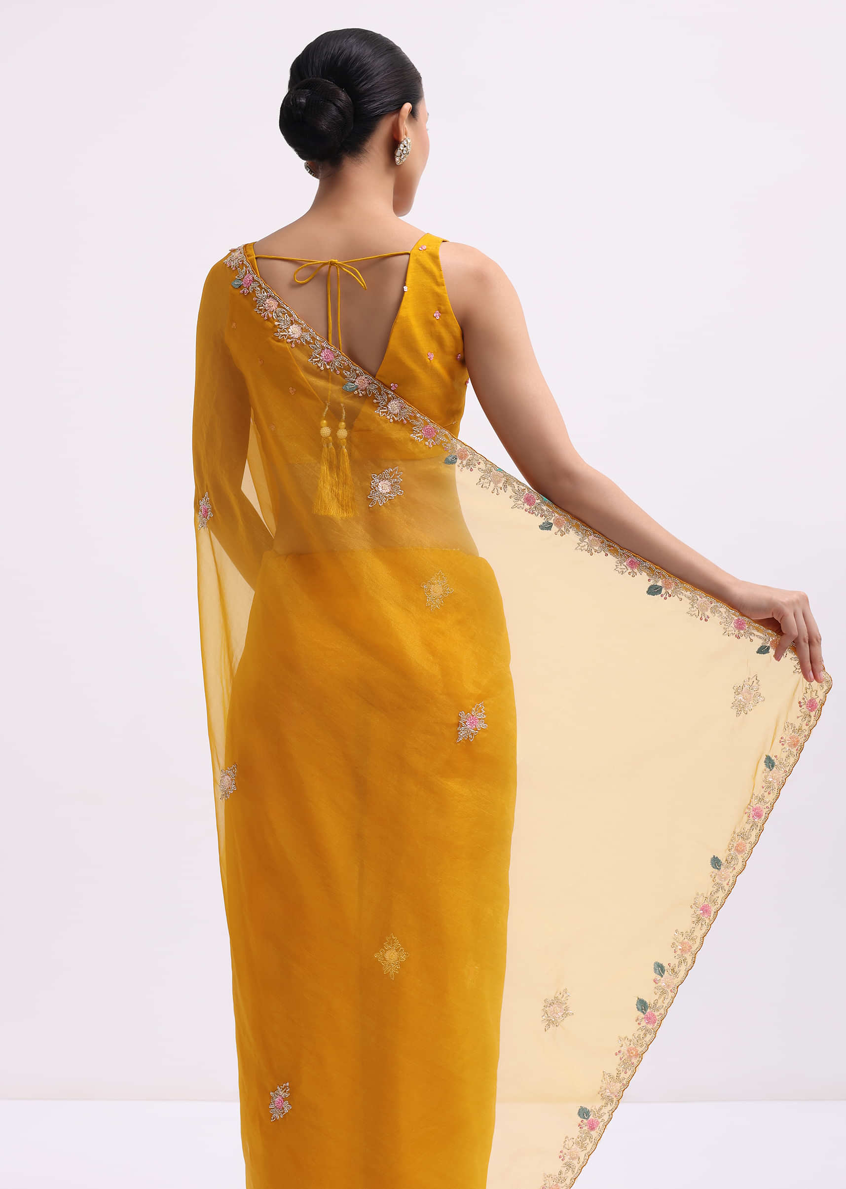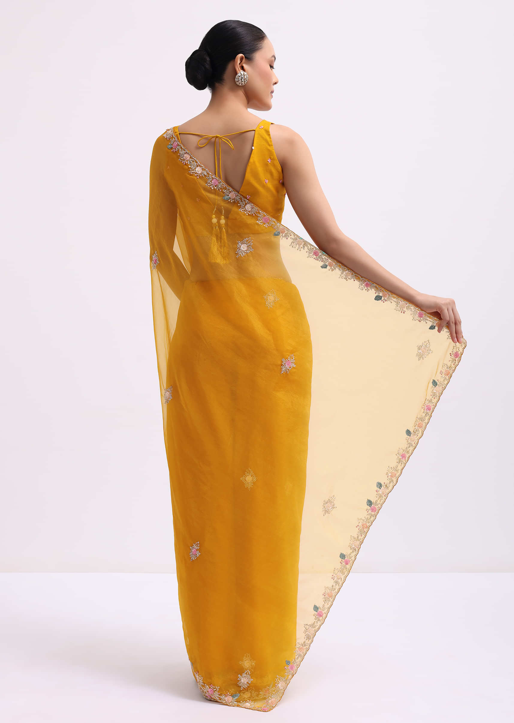 - Fashioned from indulgent organza fabric and embellished with detailed 3D sequined floral embroidery and a cutdana scallop border, this ensemble radiates sophistication and opulence.