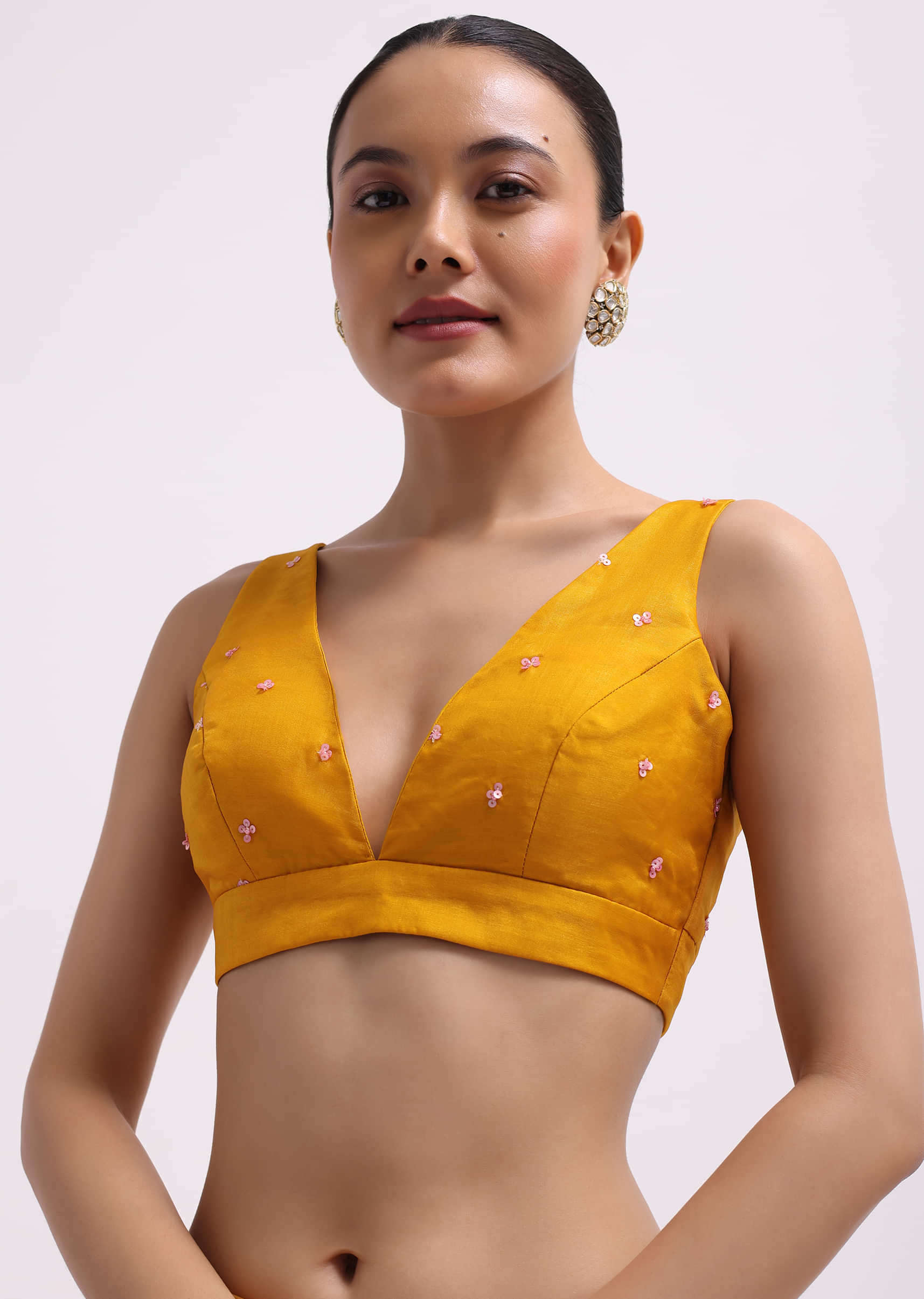 - Complemented by an unstitched blouse.
